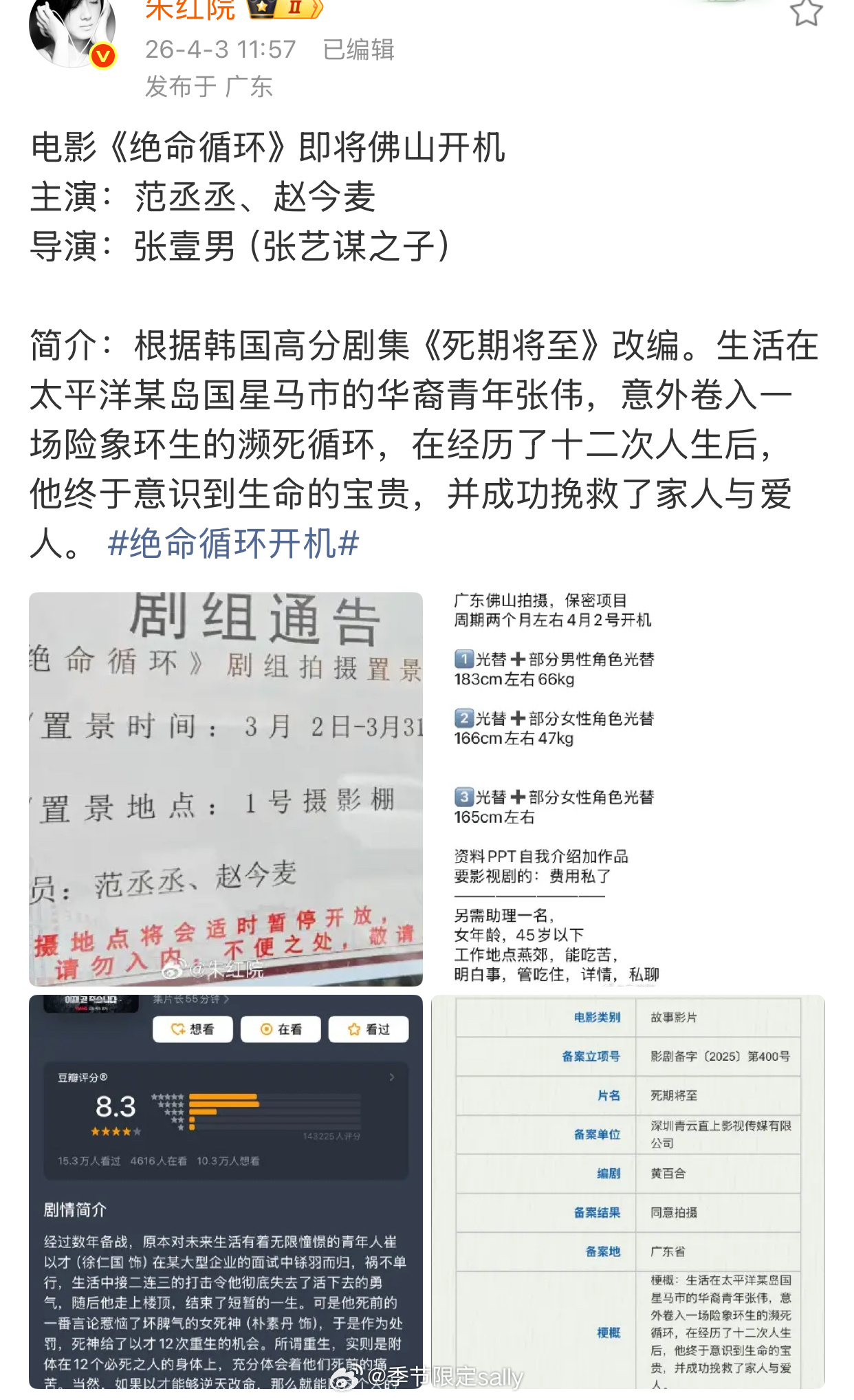 范丞丞赵今麦合作电影《绝命循环》,佛山开机,导演张壹男