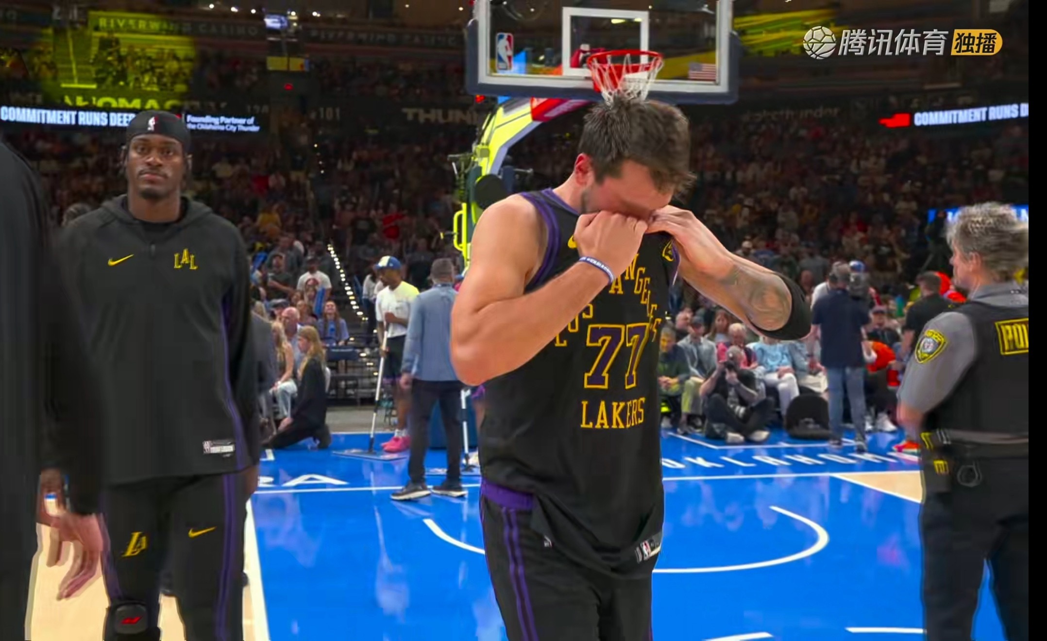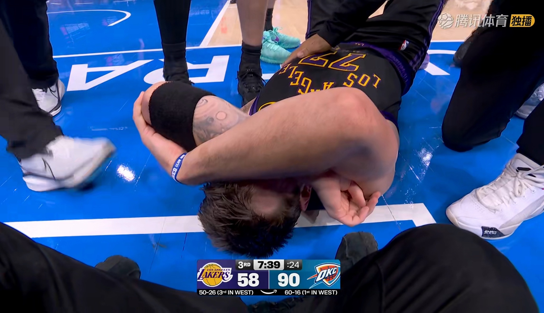 NBA洛杉矶湖人 东契奇大腿拉伤,看着不是太好。