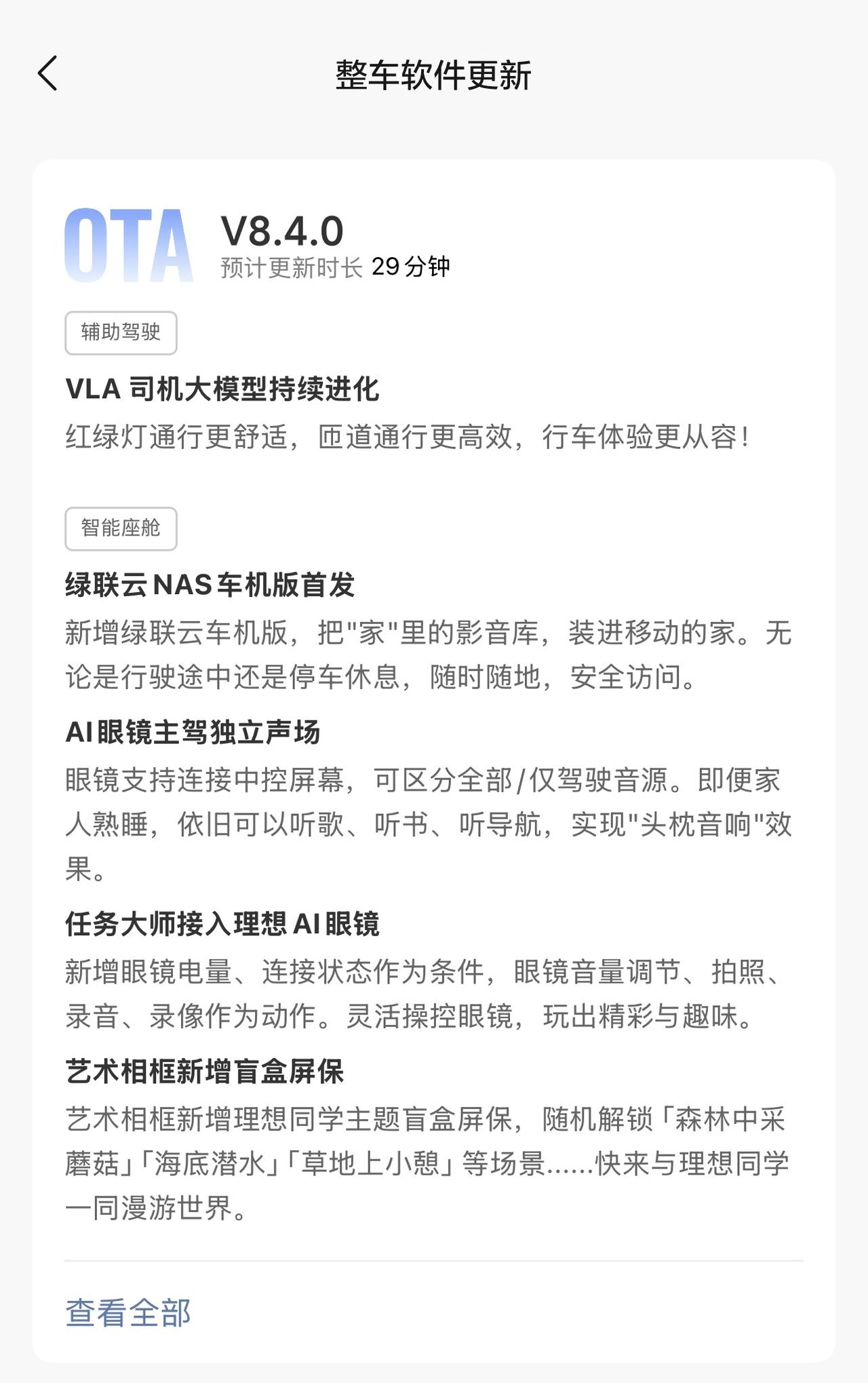 理想汽车最近在推送OTA8.4版本,看了一下i系列纯电车型升级了单踏板模式,L系列可以说基本上没什么看点,AI眼镜联动有点鸡肋了,把AI眼镜当成主驾音响用,有点脱了裤子放屁的感觉。 增加了极空间、绿联云NAS功能,可以说也是比较鸡肋了,要不就是用到车机流量要不是出行还得携带NAS设备,还不如直接上视频会员来的更直接,再说NAS云看视频、听歌、看文件,直接用手机NAS APP也能用,如果要看大屏用手机直接投屏又不卡。 智驾方便有些小幅升级,优化了VLA指挥沟通、全场景导航辅助驾驶(NOA)(优化黄灯时的车速控制策略以及ETC通道、匝道通行效率等)。 倒是车主们呼声很高的召唤功能没一点动静,去年销售一直拿着这个作为卖点,但是上线没多久就下了,然后就是了无音讯了,算不算是对车主的一种欺骗?【来自懂车帝车友圈】