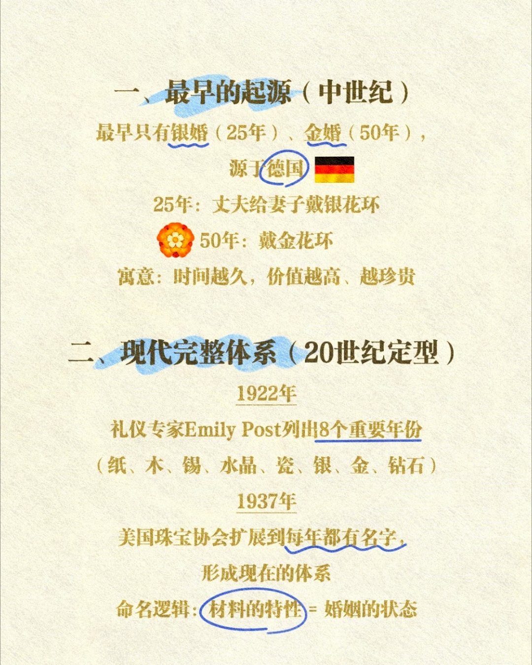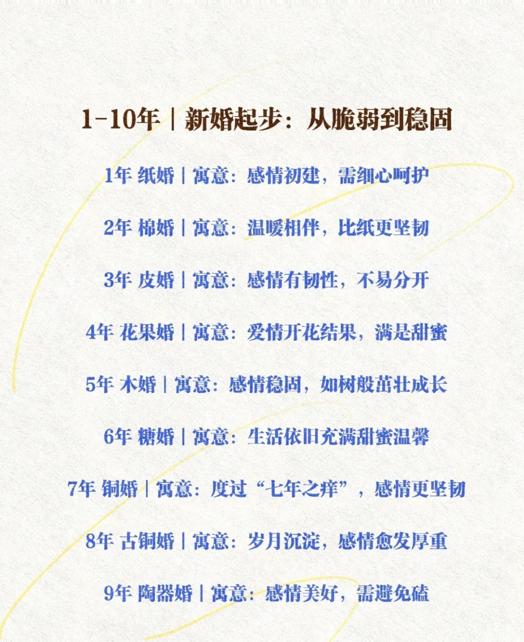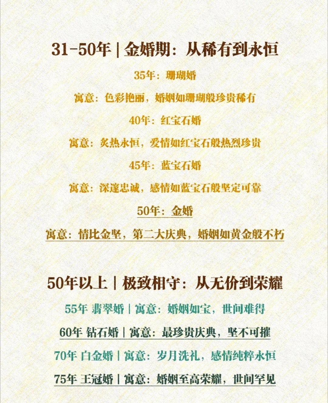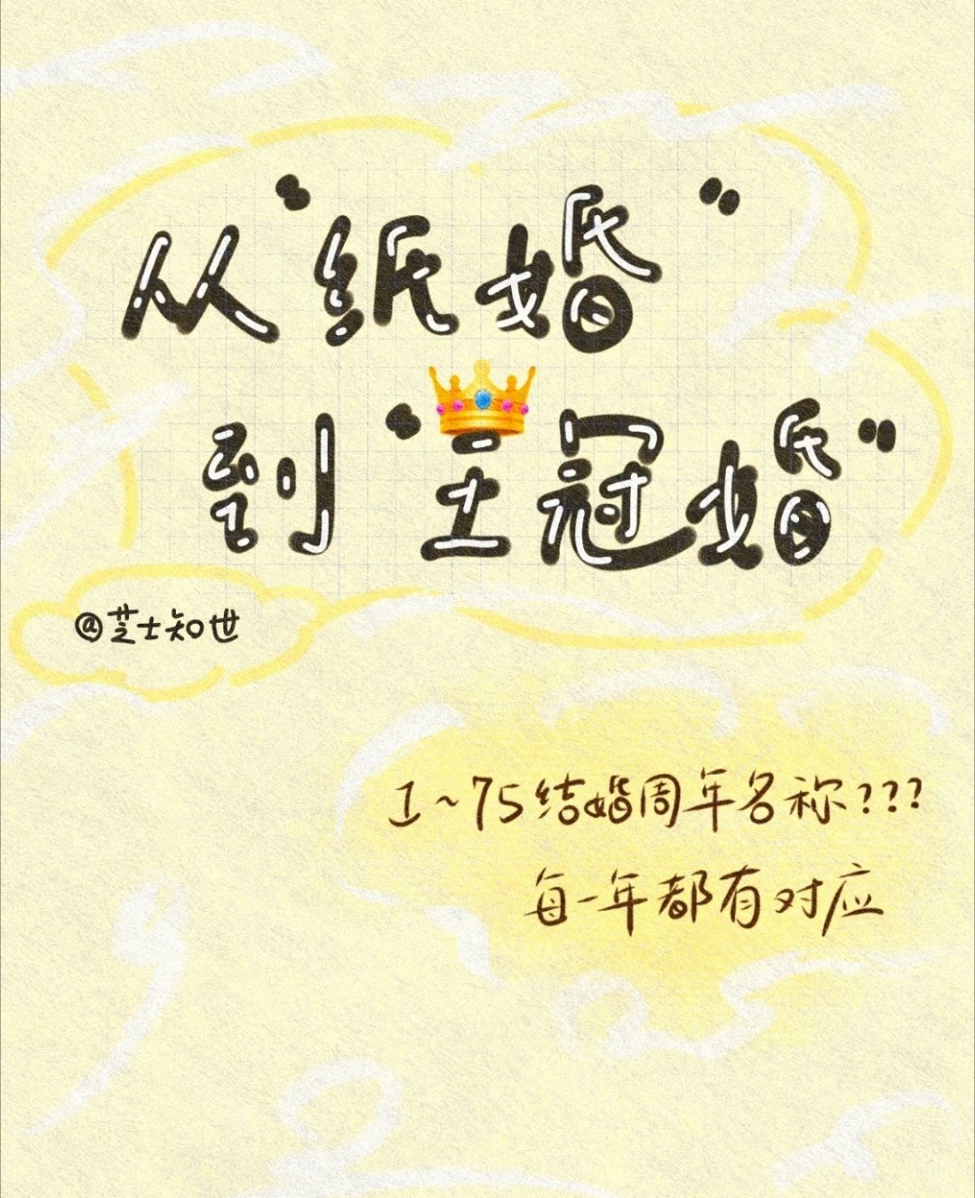 从指婚到皇冠婚,结婚1至75周年都有对应。最早只有金婚银婚,名称起源于中世纪,后