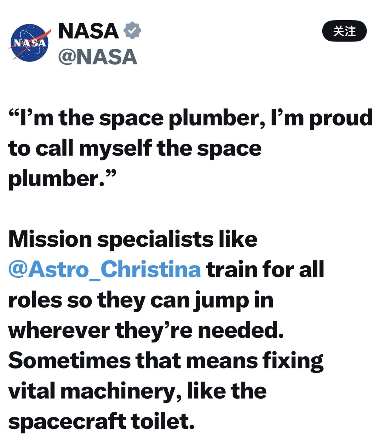 人类史上最高级的厕所维修工 “我是太空水管工,我为自己是太空水管工而感到自豪。” 像克里斯蒂娜Astro_Christina这样的任务专家接受所有岗位的培训,以便在需要时能够随时投入工作。有时这意味着维修关键设备,例如航天器的厕所。