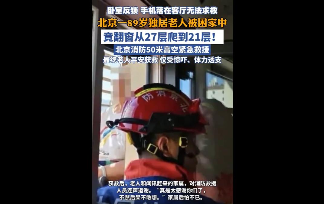 近日,北京石景山区某小区,89岁独居老人不慎反锁卧室、无法联系外界,情急之下从27层窗户爬出,攀爬时体力不支被困21层空调外机护栏。 保洁与保安发现后紧急报警,消防人员赶赴现场,暖心安抚、搭建临时通道,成功将老人救回室内,老人仅受惊吓、无大碍。 首先,我们为保洁员穆先生和保安李队长的细心与果断点赞。 他们被微弱声音吸引,及时发现了高空之上的老人,第一时间焦急提醒、紧急报警,用简单的举动为救援争取了宝贵时间。 正是他们的警惕与负责,避免了老人因体力不支坠落的悲剧发生,平凡岗位上的坚守,往往藏着最动人的善意,这份及时的发现与援手,值得我们深深敬佩。 更令人动容的,是消防救援人员的专业与温情。 面对悬在50多米高空、体力透支的老人,他们没有丝毫慌乱,迅速制定救援方案,用三角包布、安全绳固定老人,卸下护栏清理安全区域,耐心安抚老人情绪,递水、披救援服保暖,细致入微的照料,缓解了老人的恐惧与不适。 在狭窄危险的空间里,他们搭建临时“桥梁”,小心翼翼地将老人护回室内,每一个动作都充满责任与担当,用专业守护生命,用温情温暖人心。 这场惊险的救援,也让我们关注到独居老人的安全困境。 89岁老人独居,不慎反锁卧室便陷入孤立无援的境地,情急之下做出危险举动,这背后是独居老人生活的无助与安全隐患。 随着老龄化加剧,越来越多的老人选择独居,他们的生活照料、应急求助等问题,值得我们每一个人重视,也需要家庭、社区与社会共同发力。 我们能理解老人当时的焦急与无助,被困卧室、无法联系外界,孤立无援的处境让她失去了冷静,才做出攀爬外墙的危险决定。 这也提醒我们,作为子女,应多关注独居老人的生活与需求,定期探望、陪伴,为老人配备应急求助设备,避免类似的危险发生;社区也应加强对独居老人的关怀,建立常态化走访、帮扶机制,及时排查安全隐患,为独居老人筑牢安全防线。