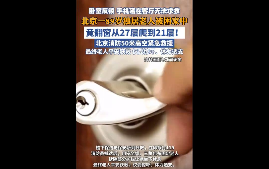 近日,北京石景山区某小区,89岁独居老人不慎反锁卧室、无法联系外界,情急之下从2