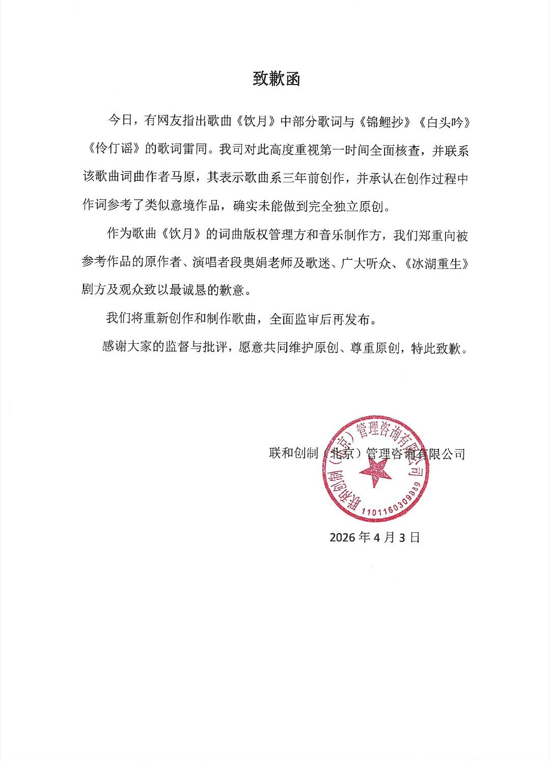 冰湖重生回应OST抄袭:《饮月》词曲作者承认创作过程中作词参考了类似意境的作品,未能做到完全独立原创。