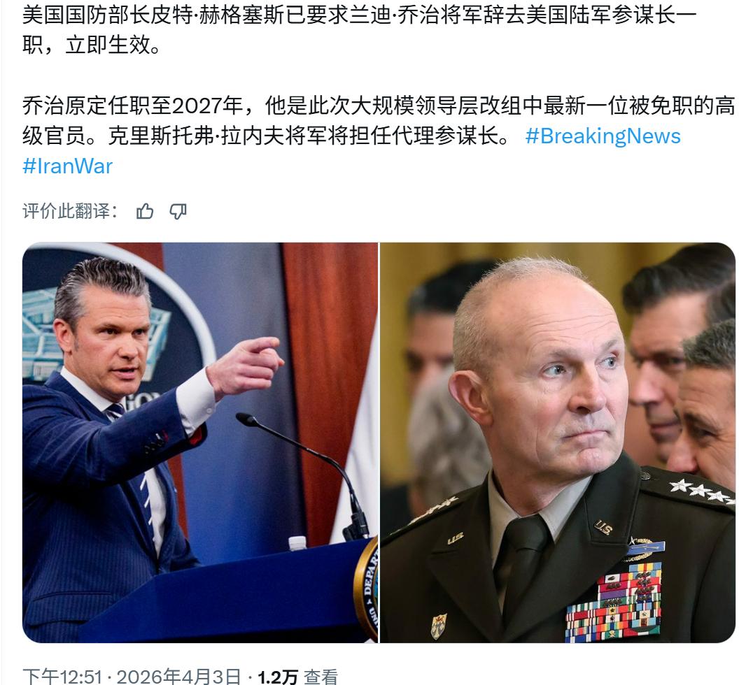 美国防长今天解除了十几名将军的职务, 包括美国陆军地面部队司令。 看样子是为了大