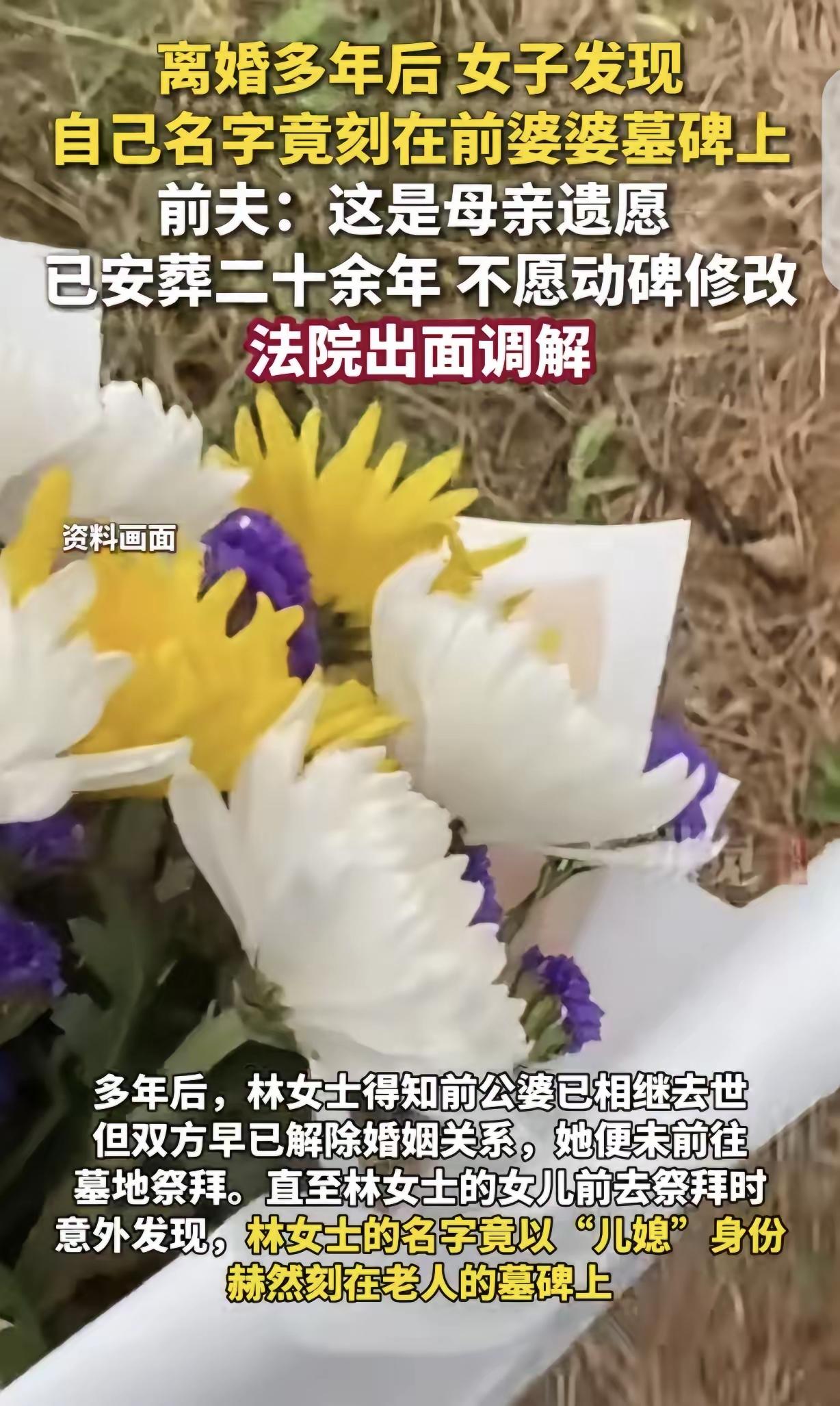 上海一女子林女士将离婚多年的前夫告上法庭,只因前婆婆离世后,前夫将林女士的名字刻在了前婆婆的墓碑上。 告上法庭后,林女士不仅要求前夫道歉,还要求前夫对自己作出一定的赔偿,承担精神损失费。 有网友就说了,没必要这么绝情吧,虽然离婚后两者已不在一起生活,但之前相处的点点滴滴也还在吧。 林女士和前夫何先生,已离婚多年,两人的女儿跟着林女士一起生活。 这么多年来,两者其实没什么交集。 然而,就是在这种情况下,林女士却将前夫何先生告上了法庭,她表示,何先生在未征得她同意的情况下,竟将自己的名字写在了前婆婆的墓碑上。 本来两者没什么交集,林女士是不知道这件事情的。 但女儿毕竟也是何先生的亲生骨肉,于是有一天女儿就去奶奶的坟前烧纸。 这一去,才发现母亲林女士的名字竟然刻在奶奶的墓碑上,回家后便把这一切告诉了林女士。 得知这个消息后,林女士感到非常生气,说实话,她和何先生分开这么多年,两人感情早已消耗殆尽,说是陌生人都不为过。 那么既然如此,为什么还要把自己的名字刻在前婆婆的墓碑上? 对于林女士来说,她真的无法接受这一点。 于是便发生了开头的一幕,林女士将何先生告上了法庭,要求何先生道歉,还要求何先生对她作出赔偿。 先来说说最后的结果吧,其结果是,何先生确实给林女士道了歉,也赔了她一定的钱。 同时还把林女士的名字从母亲墓碑给抹去了。 其实,这并不是法院判决的结果,对于这种小事,法院不可能去判决。 实际上,这是林女士和何先生共同商量出来的一个结果。 两人商量的时候,何先生没有指责这是一件小题大做的事,而是最先考虑到了林女士内心的感受。 他觉得,既然林女士接受不了这件事,并且提出了自己的诉求,他就应该尽可能满足林女士。 两人虽然分开了,但他依然不能亏欠林女士。 说实话,何先生的做法还是挺仁至义尽的。 得到这样一个满意的答复之后,林女士本人也没有任何要求了,她觉得,这件事情处理得非常合心意。 但这件事发生后,很多人在纠结一个问题,林女士是不是真的有些小题大做了呢? 离婚只不过是从名义上让两个人撇清关系,但一家人曾经的感情,点点滴滴,以及温情,都要全部忘却吗?真的有必要如此吗? 其实这种看法有失偏颇,夫妻之间无论因何种原因离婚,既然已经离婚,那么林女士便不再是何先生的妻子,这情况下,便不能轻易的以妻子的名义,做一些可能会影响前妻的事。 更不能把前妻的名字随意写在自己母亲的墓碑上,显然不合适。 想写可以,除非征得林女士的同意。 既然事先没和林女士打招呼,就不该贸然进行。 虽然法院不可能判决这种鸡毛蒜皮的小事,但何先生肯定要通过自己的方式,来弥补自己孤注一掷的做法对林女士带来的损失。 所谓鸡毛蒜皮无小事,正是如此。 总结,虽然已经离婚,但是当两人遇到了矛盾,还是要第一时间解决。 这才算是真正尊重对方。 对此,你怎么看? 参考资料,大象新闻,2026年4月3日报道。