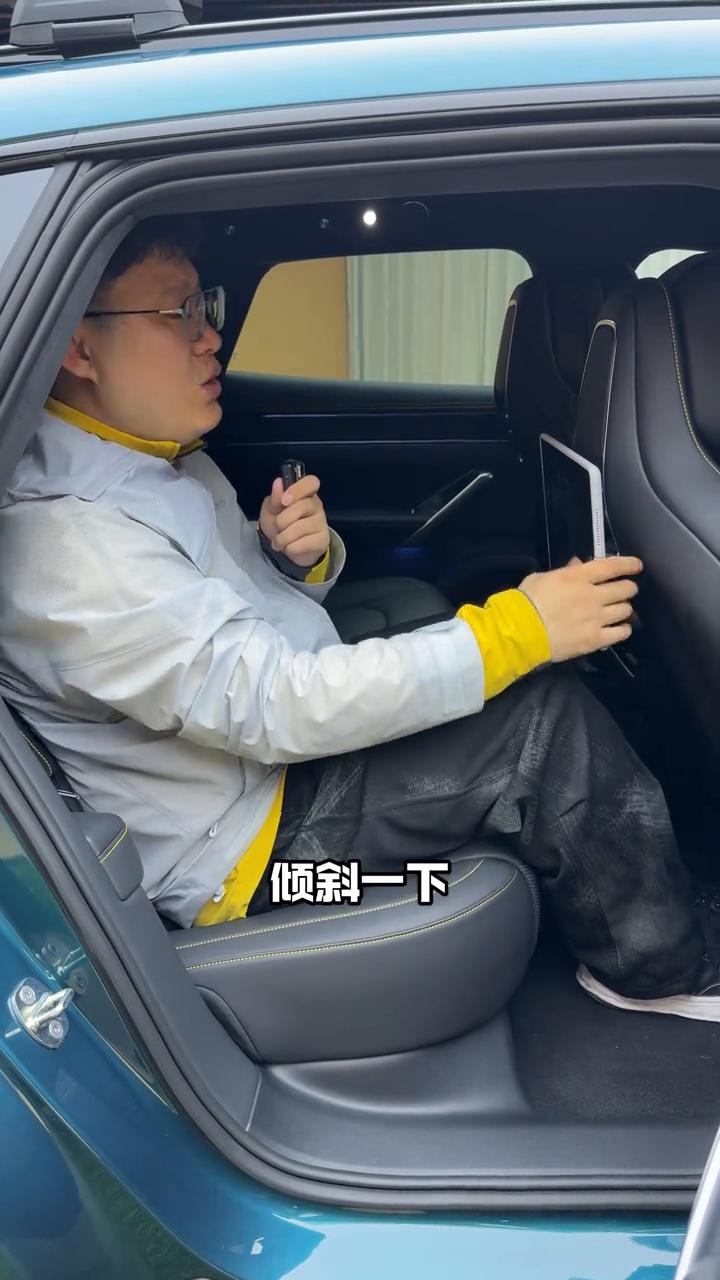但是我想吐槽它的是,你看到这个位置了没有?它现在已经是最立的状态,副驾只要把座椅稍微的倾斜一下,我在后排看这块屏幕就会巨痛苦。我这个高度是斜向下来看这块屏幕的,不管是操作,不管是观看都是不方便的。