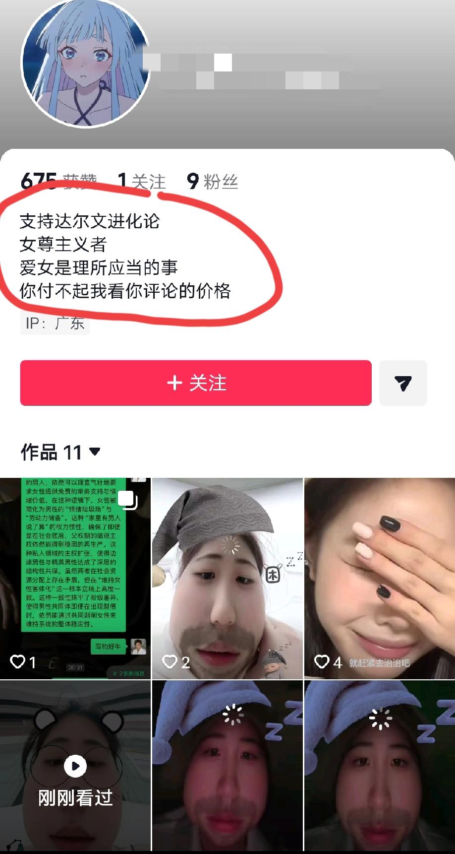 女生发视频吐槽:为什么女生要穿胸罩不能露点?呼吁男生也应该穿胸罩,男生的胸部也应该遮起来,像内裤一样遮起来…… 特别好奇这位女生为何会说出如此逆天的言论来,就去看了一下她的主页,立马就恍然大悟了,什么“达尔文进化论”、“女尊主义者”等等,貌似还说的挺高大上的,我都怀疑她有没有翻过“进化论”这本书,书里面到底讲点什么她到底知不知道? 都不知道现在这些小女生整天脑子里在想点啥?
