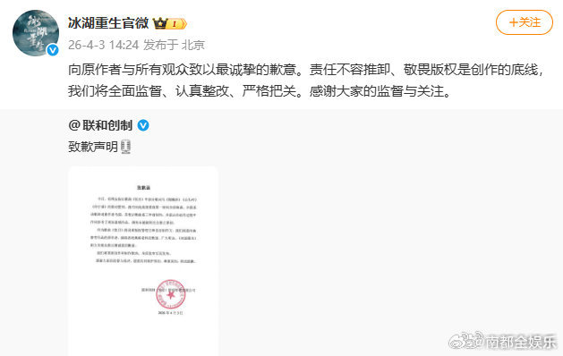 冰湖重生剧方道歉冰湖重生回应OST抄袭今日,《冰湖重生》OST制作方发声明回应冰湖重生OST歌词被指抄袭 ,称歌曲系三年前创作,创作过程中作词参考了类似的意境作品,确实未能做到完全独立原创。随后,词作者也发文道歉。