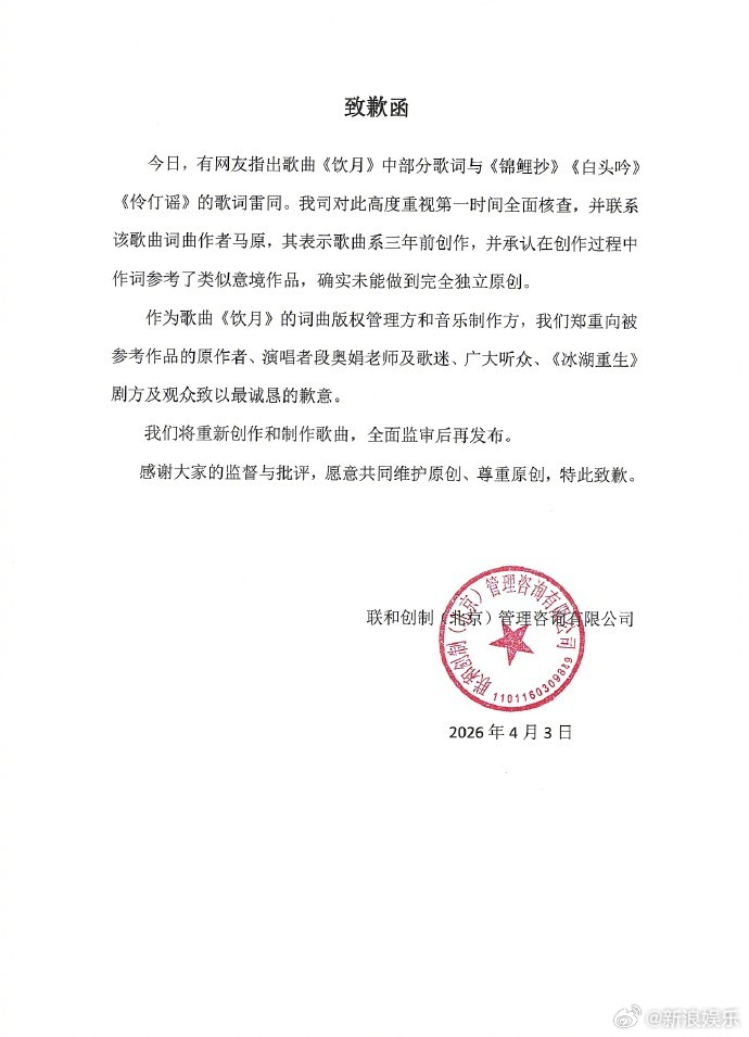 冰湖重生回应OST抄袭冰湖重生剧方道歉 有网友发现《冰湖重生》OST歌词疑似抄袭三首经典古风歌曲,引发热议。刚刚,OST制作方发声明回应,称歌曲系三年前创作,创作过程中作词参考了类似的意境作品,确实未能做到完全独立原创。词作者随后也发文道歉。