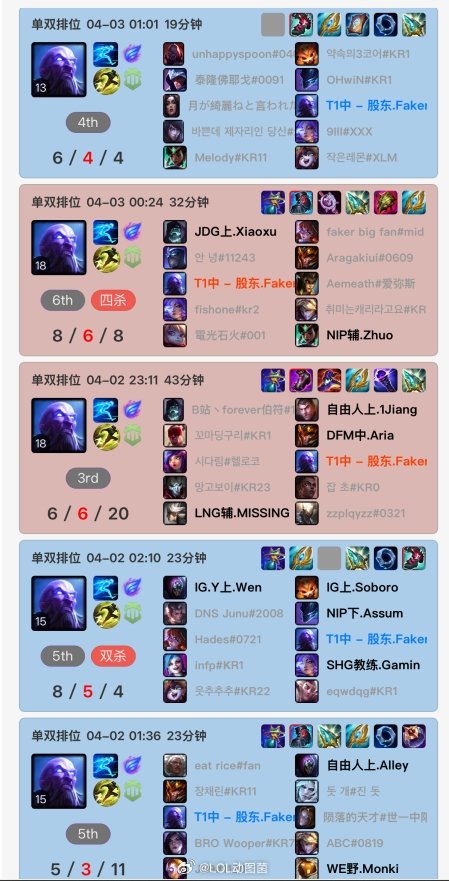 4月1日T1零比二不敌KT,赛后根据韩服排位统计小程序显示,Faker从4月2日凌晨开始连续在韩服排位玩了7把瑞兹。goat确实老了,从上赛季就能看出来下滑了很多