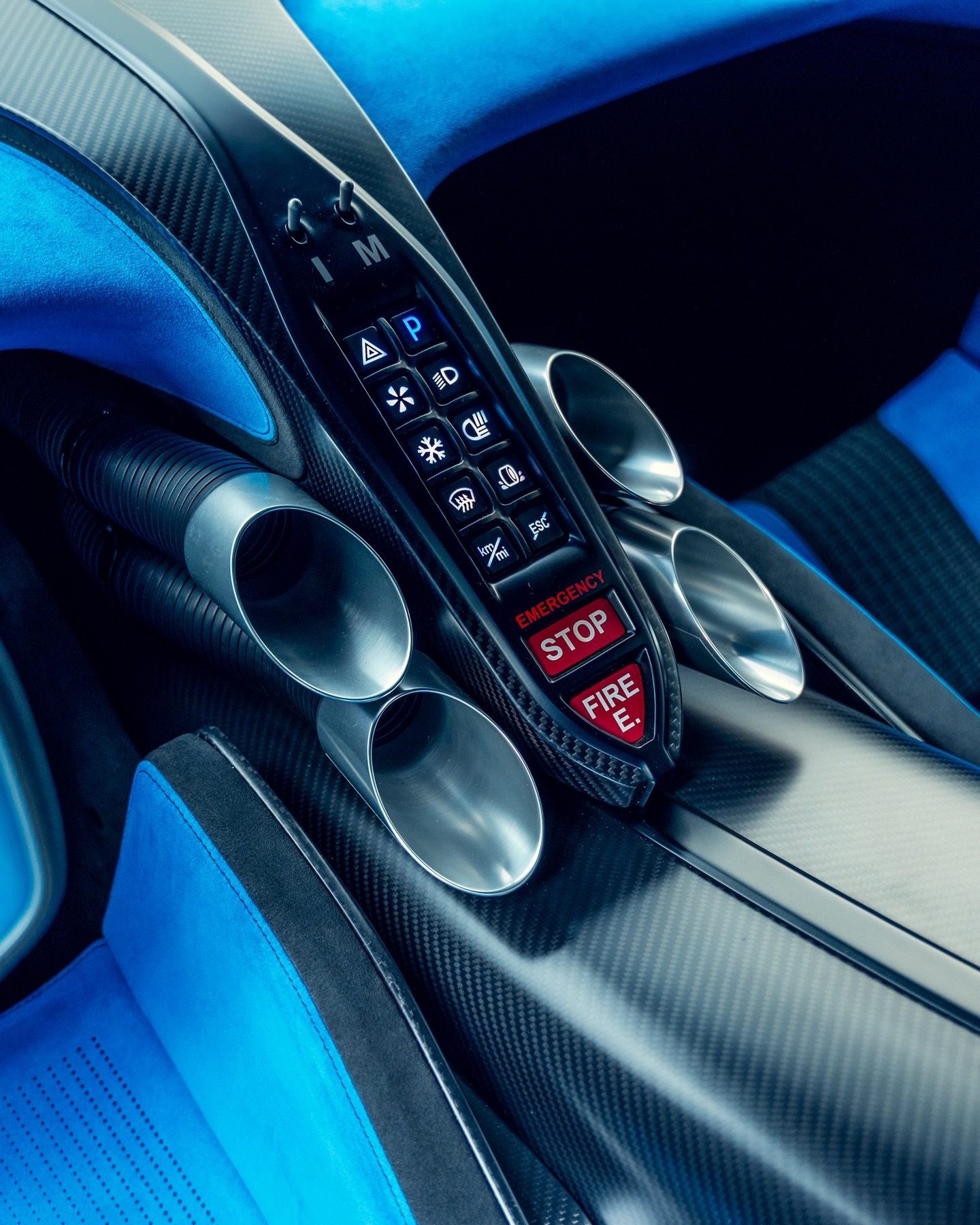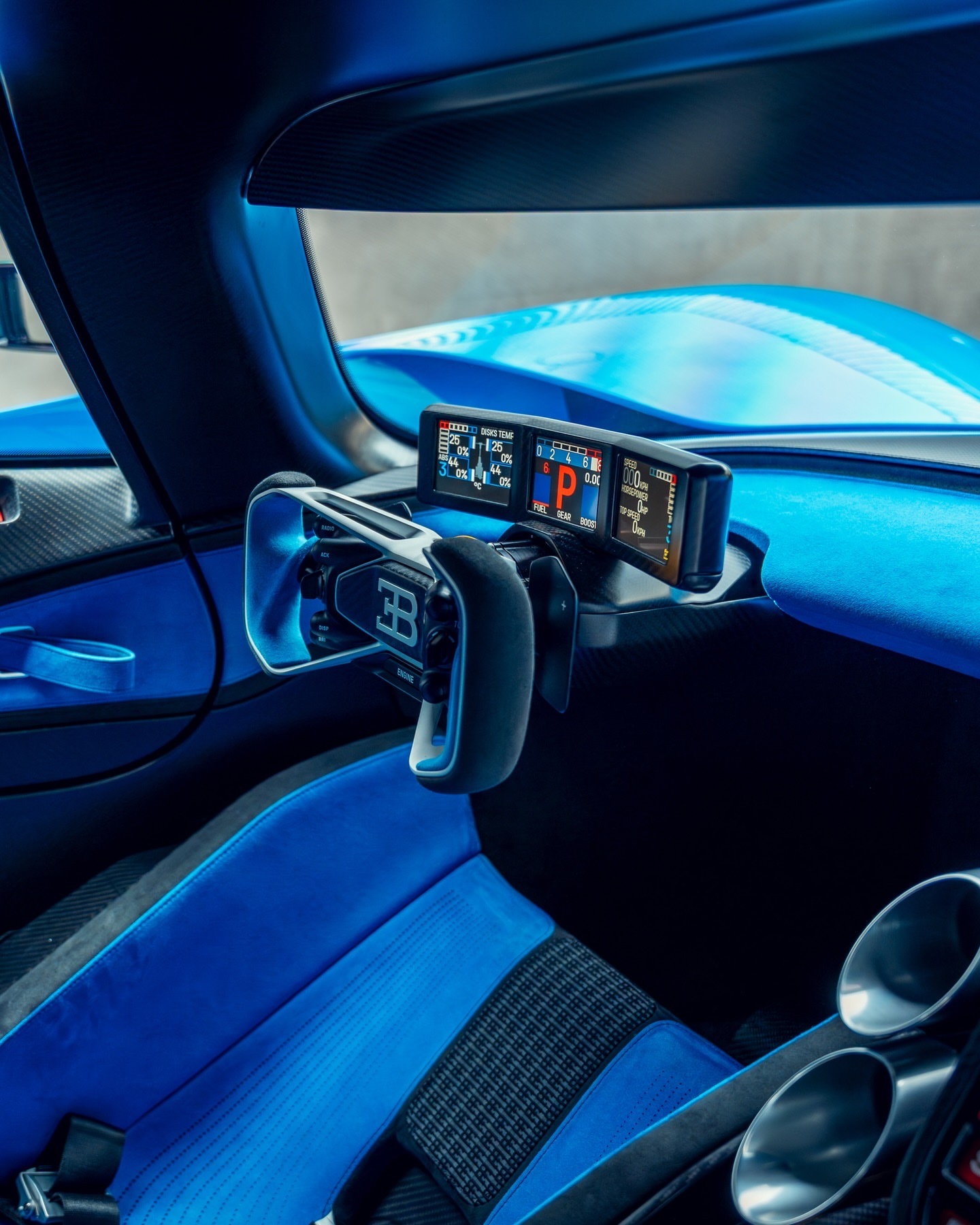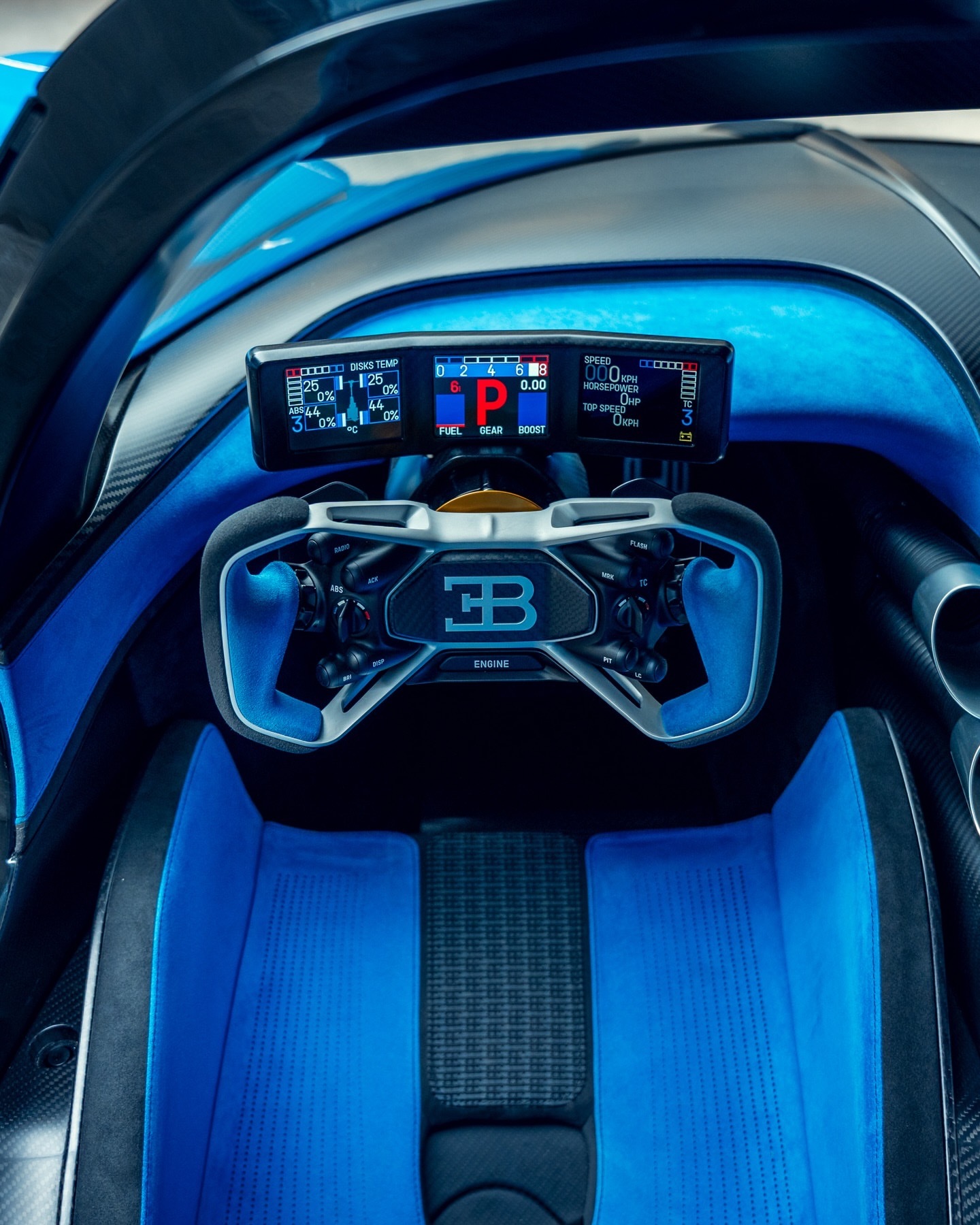 这台特定车型是40台中最非凡的之一。选配了价值291,000欧元的工厂配置,其外观采用了布加迪标志性的双色分割——敏捷蓝调碳纤维和夜曲漆面,并以法国国旗图案和夜曲轮毂点缀。内饰方面,法国赛车蓝和Beluga黑色Alcantara面料覆盖了每一处表面,搭配抛光铝饰条和花岗岩色内部签名线,共同构成了一个完全为追求速度而从头打造的驾驶舱。里程表读数仅为359公里。