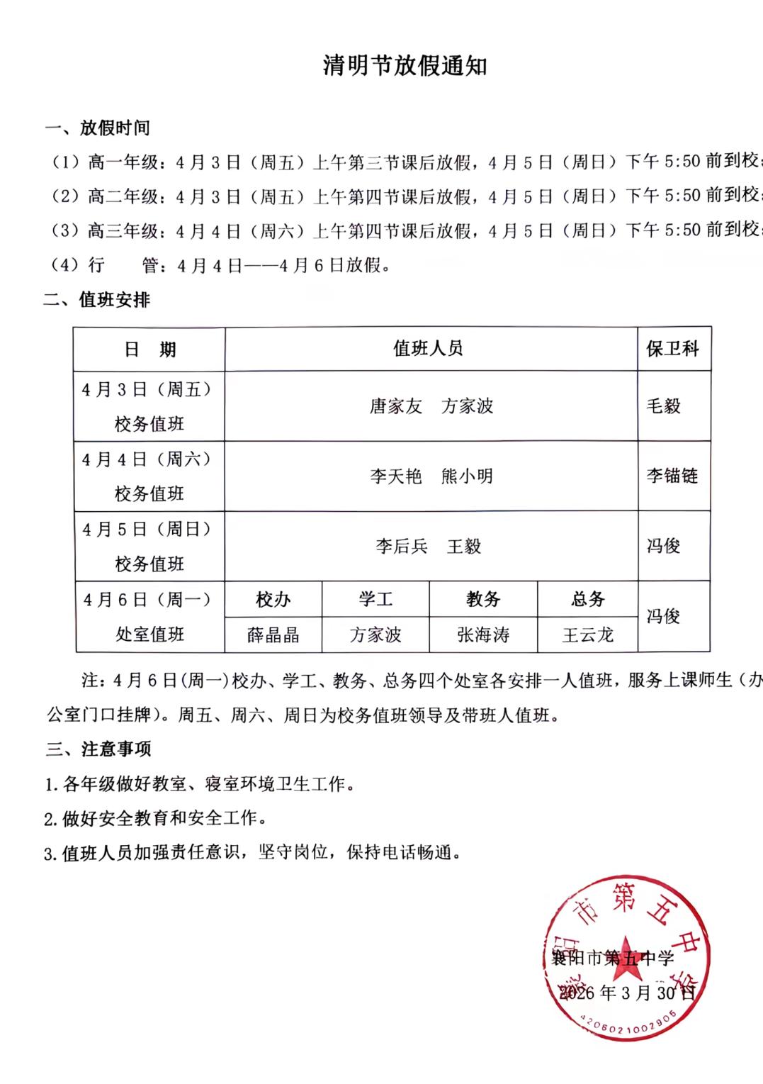 湖北高三清明节放假几天? 今天是2026年4月3日,周五,明天就将迎来清明三天假期。 这个法定节假日,一般高一和高二年级会放假三天,对于高三毕业年级来说,具体的放假时间,各校安排不尽相同。今天距离高考还剩65天,高三年级这个清明假期一般不会放满3天假。据了解,鄂南高中高三放假2天,襄阳五中高三放假一天。 走过路过的湖北高三家长们,李老师想问一下大家,这次的清明节,您家娃的学校放假几天?欢迎大家在评论区积极交流反馈!