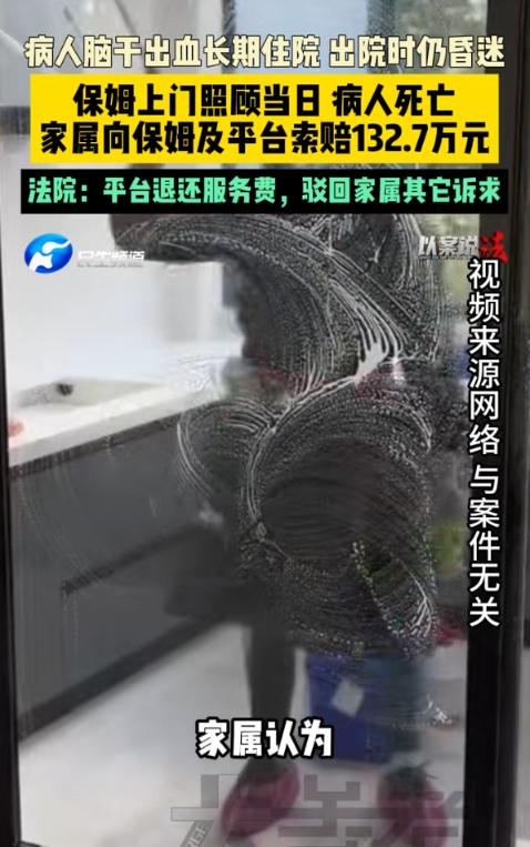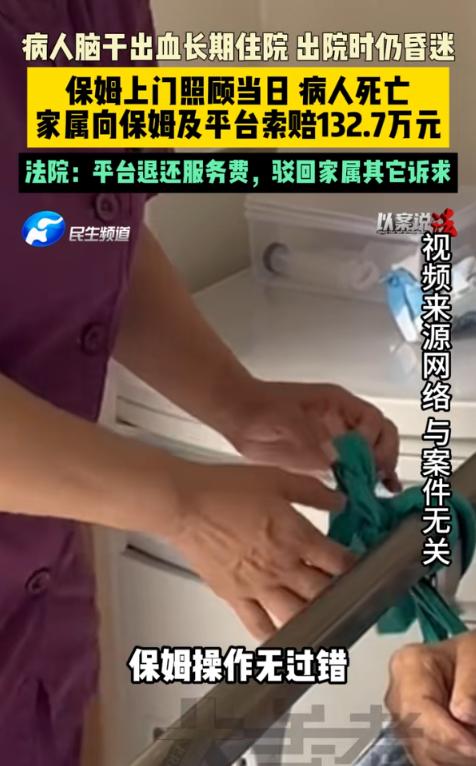 “差点解释不清了!”2024年5月,江苏淮安,一男子因病昏迷,家属为了让男子得到更好照料,便通过家政平台请了保姆,没想到保姆上门照顾后,男子当日死亡,家属认为保姆和平台有问题,将双方告上法院。索赔132.7万元!网友:好大一口锅! 一天,金某正在家中,但是他突然毫无征兆倒地并失去意识。 家人发现后来不及多想,立刻拨通急救电话,争分夺秒地将他送往附近医院接受紧急救治。 经过医护人员全方位的细致检查,最终确诊金某患上的是脑干出血。 这种病症在医学临床上属于典型的急危重症,不仅诊疗过程难度极高,死亡率也一直处于高位。 即便能够侥幸稳住了生命,后续也大概率会伴随瘫痪、长期昏迷等难以逆转的严重后遗症。 那段时间,金某的家人放下了所有事情,日夜守在病房外,熬过了无数个不眠之夜,心里只有一个念头:只要金某能活下来,付出再多都愿意。 经过一段时间的精心治疗,金某的病情逐渐趋于稳定。 但令人遗憾的是,他始终没有苏醒,一直处于深度昏迷状态,只能依靠鼻饲和药物维持生命。 在医院住院治疗了一段时间后,家属考虑到,医院的护士需要兼顾多个病人,无法做到24小时贴身照料。 相比之下,让金某回到熟悉的家中休养,熟悉的环境或许能让他的身体状态有所改善,于是一家人最终下定决心,将金某接回家里进行照料。 可现实的难题很快摆在眼前,家里的成年人都有各自的工作要忙,还要处理日常琐事,根本抽不出足够的时间,全天24小时寸步不离地守着昏迷的金某。 看着病床上毫无意识的金某,家属既心疼又无奈,反复琢磨后,终于想到了一个办法——通过家政平台聘请一位专职保姆。 如今的家政平台十分便捷,只需在手机上操作,就能浏览众多保姆的资料,包括从业年限、资质证明和用户评价等。 家属花了好几天时间,对比了多家平台的不同保姆,反复筛选、多方打听,最终在一家口碑较好的家政平台上,选中了从事家政服务多年的尹某。 双方签订的家政服务合同里,对尹某的工作范围有着清晰且明确的界定,明确表示她的服务仅围绕日常起居展开,全程不涉及任何需要专业医疗知识的护理工作。 整个上午,尹某都按照家属的要求和合同约定,认真地完成着各项照料工作,每隔一段时间就会查看一下金某的呼吸和体温,及时为他翻身,全程都十分专注、负责。 但在下午的时候,尹某在查看金某的状态时,突然发现他的呼吸变得异常微弱,整个人的状态看起来十分危急。 尹某瞬间慌了神,但很快就强迫自己冷静下来,一边迅速拿出手机拨打了120急救电话,一边联系了金某的家属。 急救人员赶到后,立刻对金某进行了紧急抢救,但最终还是没能留住金某的生命,当天下午,金某不幸离世。 突如其来的噩耗,让金某家属陷入了巨大的悲痛之中,他们无论如何都无法接受,早上还好好的人,仅仅经过保姆半天的照料,就突然离世了。 悲伤过后,愤怒和疑惑涌上心头,他们纷纷围向尹某,情绪激动地追问,认为是尹某在照料过程中操作不当,才导致金某病情恶化、不幸离世。 面对家属的质问,尹某显得手足无措,反复解释自己全程都是按照合同约定和家属的要求操作,没有任何不当行为,但家属根本不愿相信她的辩解。 最终,金某家属将他们告上了法庭,提出了132.7万元的赔偿要求。 法官首先对双方签订的家政服务合同进行了仔细核查,并调取了金某家中的监控录像,逐帧查看了尹某当天的照料全过程。 从监控画面中可以清晰地看到,尹某整个照料操作都十分规范,无论是擦身、按摩还是翻身,动作都轻柔规范,没有任何粗暴操作,也没有出现任何护理不当的行为,全程都在认真履行自己的工作职责。 除此之外,主治医生也出庭明确表明,金某本身病情危重,出院时就处于深度昏迷状态,随时可能出现呼吸、心跳骤停等意外情况。 对于这些隐藏的健康风险,医院方面早已如实、详细地告知了金某的家属,家属不仅认真了解了所有风险,还签字确认了风险自担书,明确清楚后续可能发生的各类意外情况,不存在不知情的情形。 最终,法院作出了判决:驳回金某家属的诉讼请求,同时该家政平台将此前收取的7300元服务费,全额退还给金某家属。 金某家属对一审判决结果不服,随后提起上诉。 二审法院经过审理后,认为一审判决事实清楚、证据充分,最终作出了维持原判的决定。 (信息来源:民生大参考《病人脑干出血长期住院,出院时仍昏迷,保姆上门照顾当日病人死亡,家属向保姆及平台索赔132.7万元,法院:平台退还服务费,驳回家属其它诉求》)