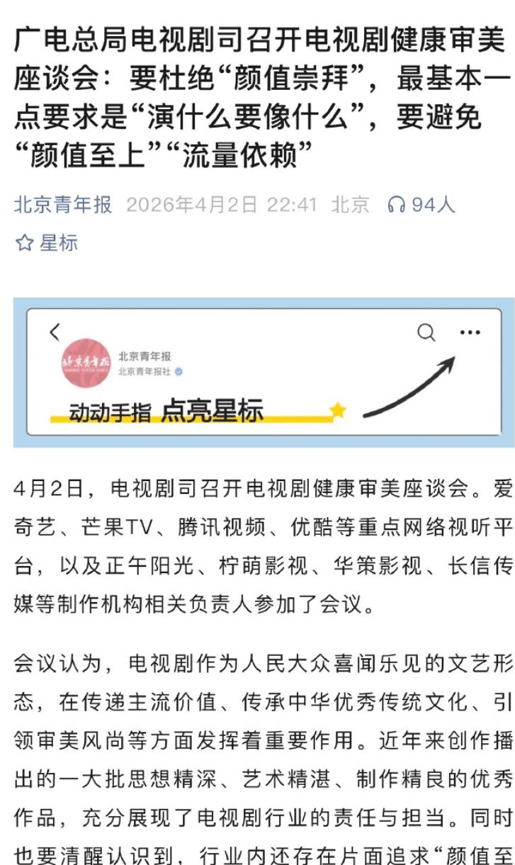 这也是《足浴》带来的影响吗? 2026年4月2日,广电总局召开电视剧健康审美座谈会。 当着各大平台、影视公司的面,直接点名批评! 吐槽的就是当下最让人反感的乱象: 演员妆容过度,服化道脱离角色! 并且首次明确提出硬性要求:演什么要像什么! 这话,早就该说了! 现在的不少电视剧,简直离谱到可笑。 打仗的将军,满脸粉底液,发型纹丝不乱。 号称浴血奋战,连一点风沙痕迹都没有。 网友吐槽,这哪是沙场悍将,分明是“粉底液将军”! 还有古装剧,不管身份高低、家境好坏。 演员清一色浓妆艳抹,假睫毛飞上天。 丫鬟比小姐还精致,乞丐都能化着全妆讨饭。 服化道华丽到浮夸,完全脱离历史、脱离角色。 更可气的是,演员只顾着扮美,完全不顾角色本身。 演农民,皮肤白皙细腻,连一点日晒痕迹都没有。 演医生,上班浓妆艳抹,口红比病人的气色还好。 演军人,妆容精致得像拍写真,毫无铁血气质。 说白了,就是本末倒置! 电视剧的核心是讲故事、塑人物。 不是比谁更精致、谁更养眼。 之前《楚汉传奇》里的项羽,何润东为了角色增肌。 穿上十几公斤的铠甲,往那一站,就是沙场猛将。 没有过度妆容,没有华丽服饰,却让人一眼入戏。 这才是演什么像什么! 广电总局这次出手,太及时、太解气! 杜绝颜值崇拜,摒弃畸形审美。 从“明星中心制”转向“剧本中心制”,才是正道! 服化道是为角色服务的,不是用来炫美的。 演员的本职是演戏,不是靠妆容博眼球。 观众看剧,看的是有血有肉的角色。 看的是耐人寻味的故事,不是千篇一律的精致花瓶。 “演什么要像什么”,看似简单,却是演员最基本的底线。 这不仅是对演员的要求,更是对影视行业的警醒。 唯有坚守健康审美,扎根内容、尊重角色,才能拍出好作品。 才能真正传递文化自信,不负观众的期待! 说说看,你最反感电视剧里哪种畸形审美?