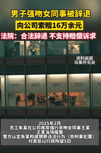 “还嫌不够丢人?”北京,一男子和一女同事去库房核对物资,男子趁女同事不备,跑上前“亲”了女同事一口,女同事恼羞成怒,转身就报了警,事后,男子被拘留5日,出来后,公司就把男子开除了,男子不服,将公司告上法庭,并索要168446.52元的赔偿,法院判了! 2025年5月15日,一封《解除劳动合同通知函》静静躺在朱某的办公桌上。 他怎么也没想到,自己精心盘算的"16万"索赔,最后连一分钱都没拿到。 朱某是北京一家公司的运营管理,2023年10月入职,合同签了三年。 本来安安稳稳干下去,前途不算差。可关键时刻,他却没控制住自己的冲动。 2025 年 2 月的一天,朱某与同部门女同事前往库房盘点货物。 四下无人之际,他见女同事弯腰记账毫无防备,顿时邪念上头,几步冲上去强行抱住她亲了一口。 女同事当场就懵了。 缓过神来,她拼命挣脱,二话不说直接报警。警方调取监控后,画面清晰显示:朱某主动上前侵犯,女同事毫无防备,被亲后立刻推开,脸上满是抗拒和反感。 结果呢?警方查明事实,认定朱某构成猥亵,依法给予其行政拘留 5 天的处罚。 这下朱某慌了。 拘留结束后,他赶紧回公司,主动找领导承认错误,还在约谈记录上签了字。他以为态度诚恳就能保住饭碗。 可公司不吃这套。 规章制度白纸黑字写明:员工受公安行政拘留的,属重大失职违规,公司有权解除劳动合同且不支付经济补偿。 朱某入职时签字确认过,明明白白。 公司当天就出具了解除劳动合同通知函:2025年5月15日起,正式解除劳动关系。 朱某傻眼了。 他反复琢磨,越想越不服气:在他的认知里,只有被判刑才能开除员工,自己只是被治安拘留,怎么就丢了工作? 他把公司告上法院,张口就要168,446.52元。还振振有词:"我没被判刑,公司不能开除我!" 法院一审二审都判了,驳回朱某全部诉讼请求。 判决说得很清楚:劳动者不仅要遵守国家法律,还得遵守公司合法有效的规章制度。 不是只有被追究刑事责任才能开除,严重违反公司规章制度,同样可以解除劳动合同。 至于朱某嚷嚷的"一事不再罚",更是驴唇不对马嘴。行政拘留是公权力对你的处罚,公司开除是民事关系调整,这是两码事! 朱某这场闹剧,说到底是法律意识淡薄,还心存侥幸。他以为"没判刑就没事",结果呢?丢了工作,败了官司,还成了别人的笑柄。 职场不是法外之地,任何触碰底线的行为,终究要付出代价。朱某的故事,该让所有人警醒。 信源:陕西都市快报2026-01-29——《近日,北京某公司库房内一名男员工“亲了下”同部门的女同事,因此以猥亵罪被行政拘留……》