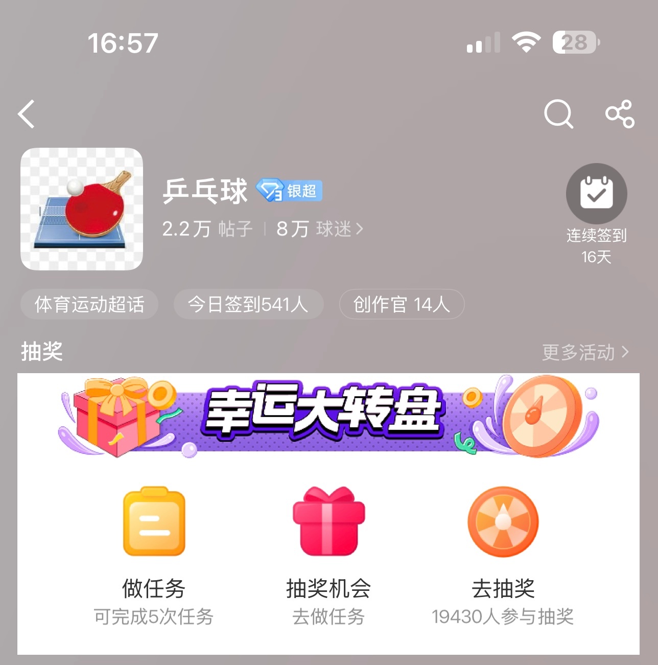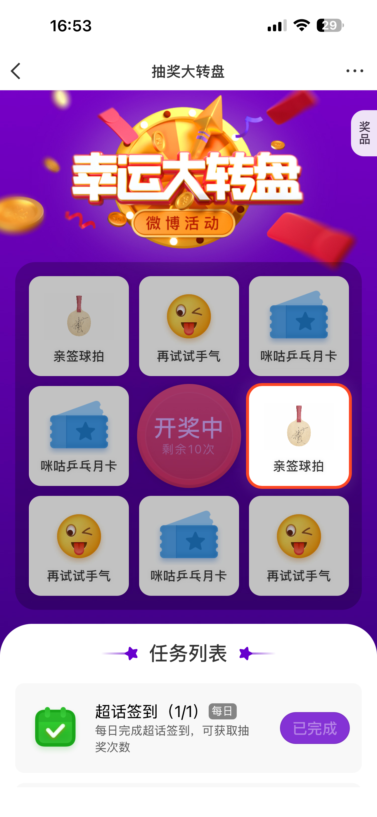 乒乓球 家人们速来!2026澳门世界杯幸运大转盘我先冲啦!完成超话点赞、评论任务就能get抽奖机会,亲签球拍、咪咕赛事月卡都在奖池里晃悠呢~我刚薅到11次抽奖机会,手气已经迫不及待要开奖啦!速来超话集合一起蹭欧气,说不定下一个抽中亲签的就是你!2026澳门世界杯幸运大转盘