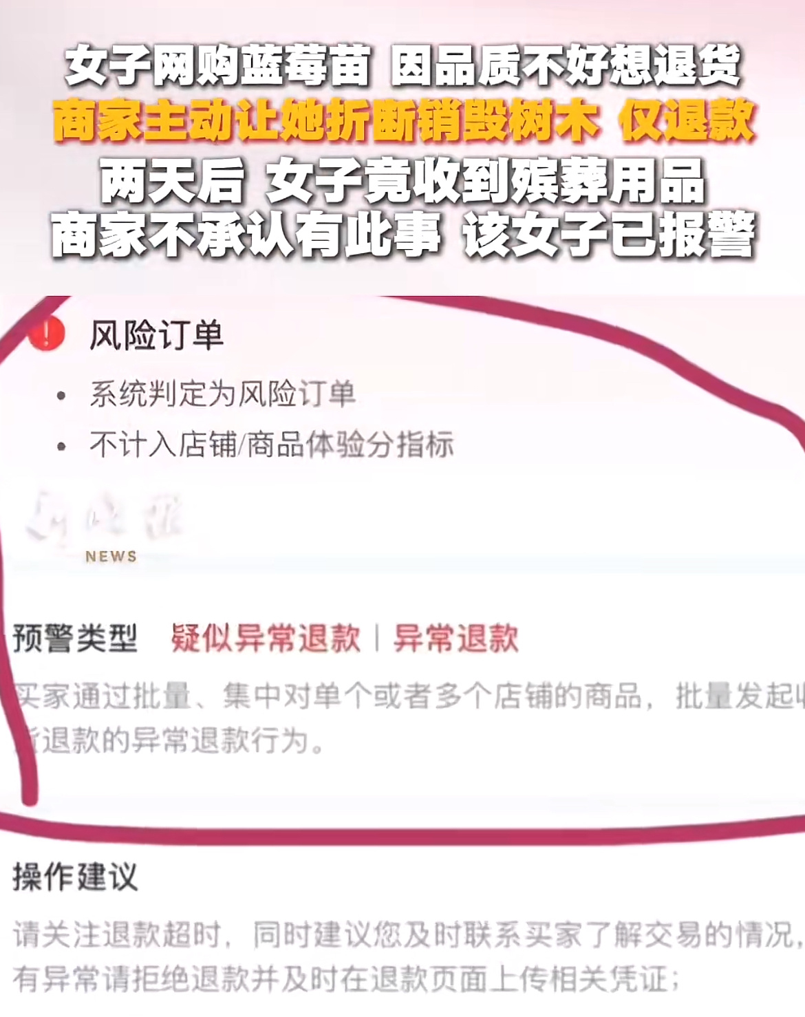 辽宁,女子网购了一株蓝莓苗,收到后觉得不好,就要退货,商家让女子不用折腾了,直接