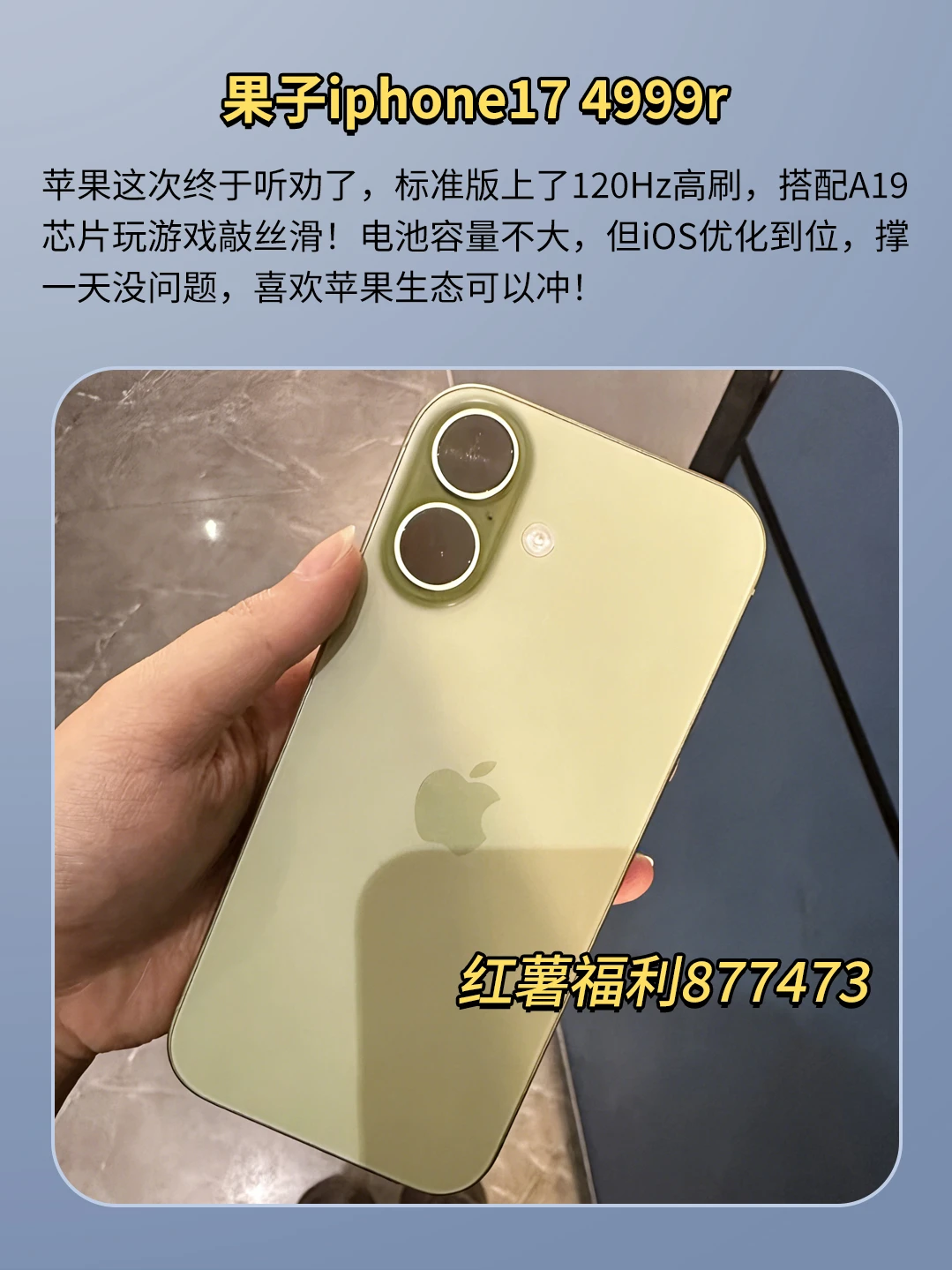 苹果这次终于听劝了,标准版上了120Hz高刷,搭配A19芯片玩游戏敲丝滑!电池容量不大,但iOS优化到位,撑一天没问题,喜欢苹果生态可以冲!