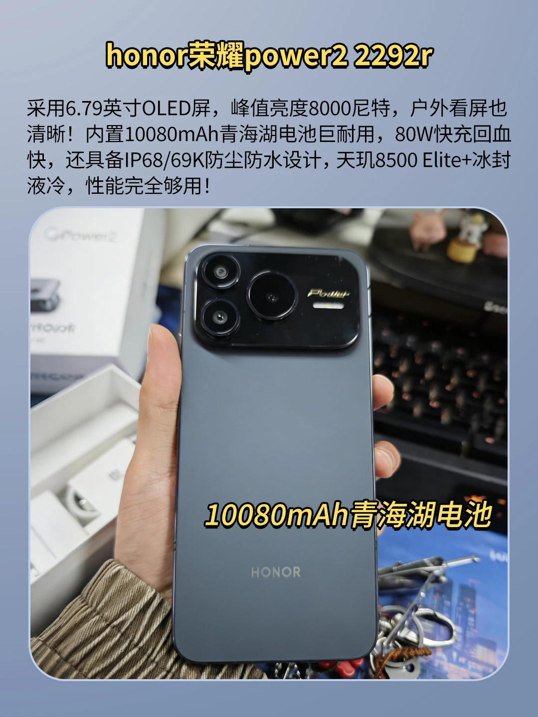 采用6.79英寸OLED屏,峰值亮度8000尼特,户外看屏也清晰!内置10080mAh青海湖电池巨耐用,80W快充回血快,还具备IP68/69K防尘防水设计,天玑8500 Elite+冰封液冷,性能完全够用!