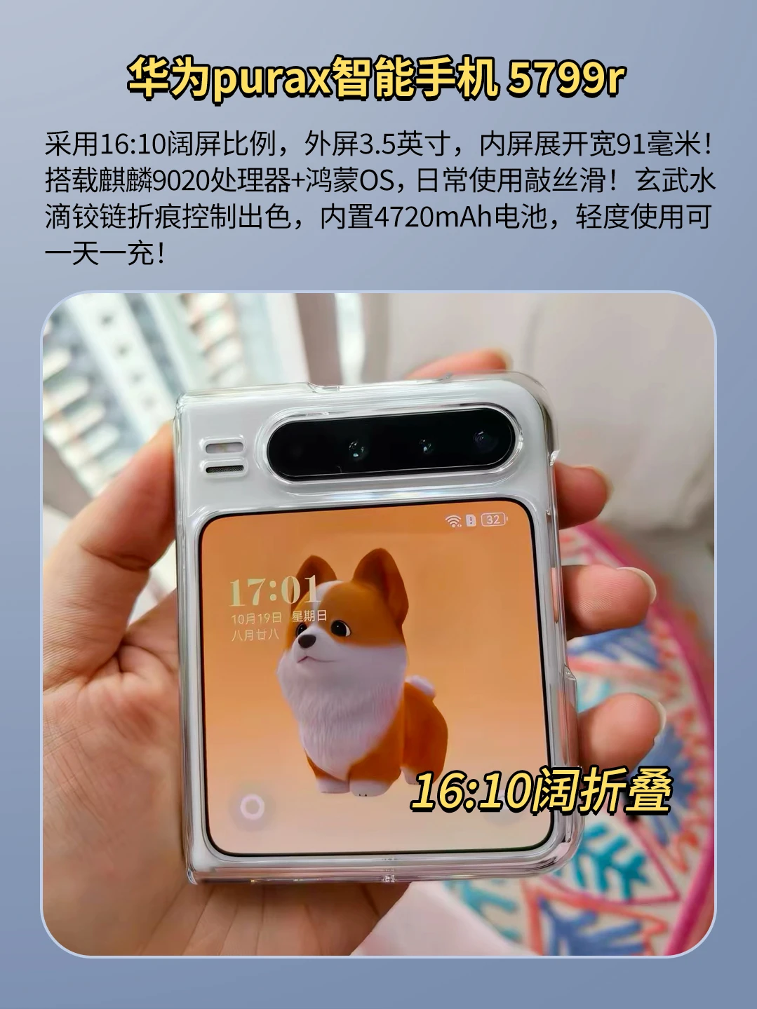 采用16:10阔屏比例,外屏3.5英寸,内屏展开宽91毫米!搭载麒麟9020处理器+鸿蒙OS,日常使用敲丝滑!玄武水滴铰链折痕控制出色,内置4720mAh电池,轻度使用可一天一充!