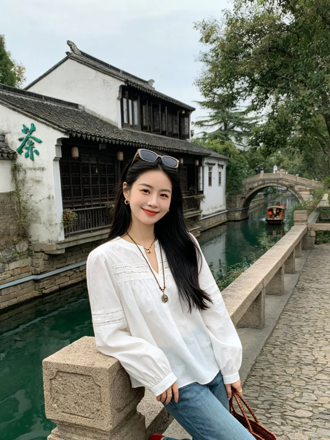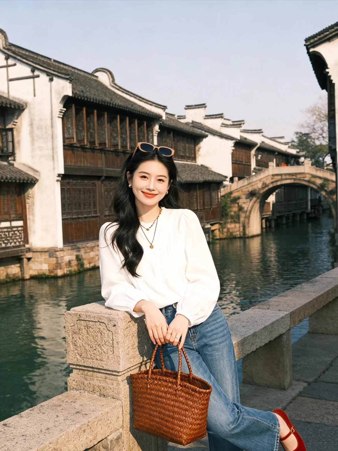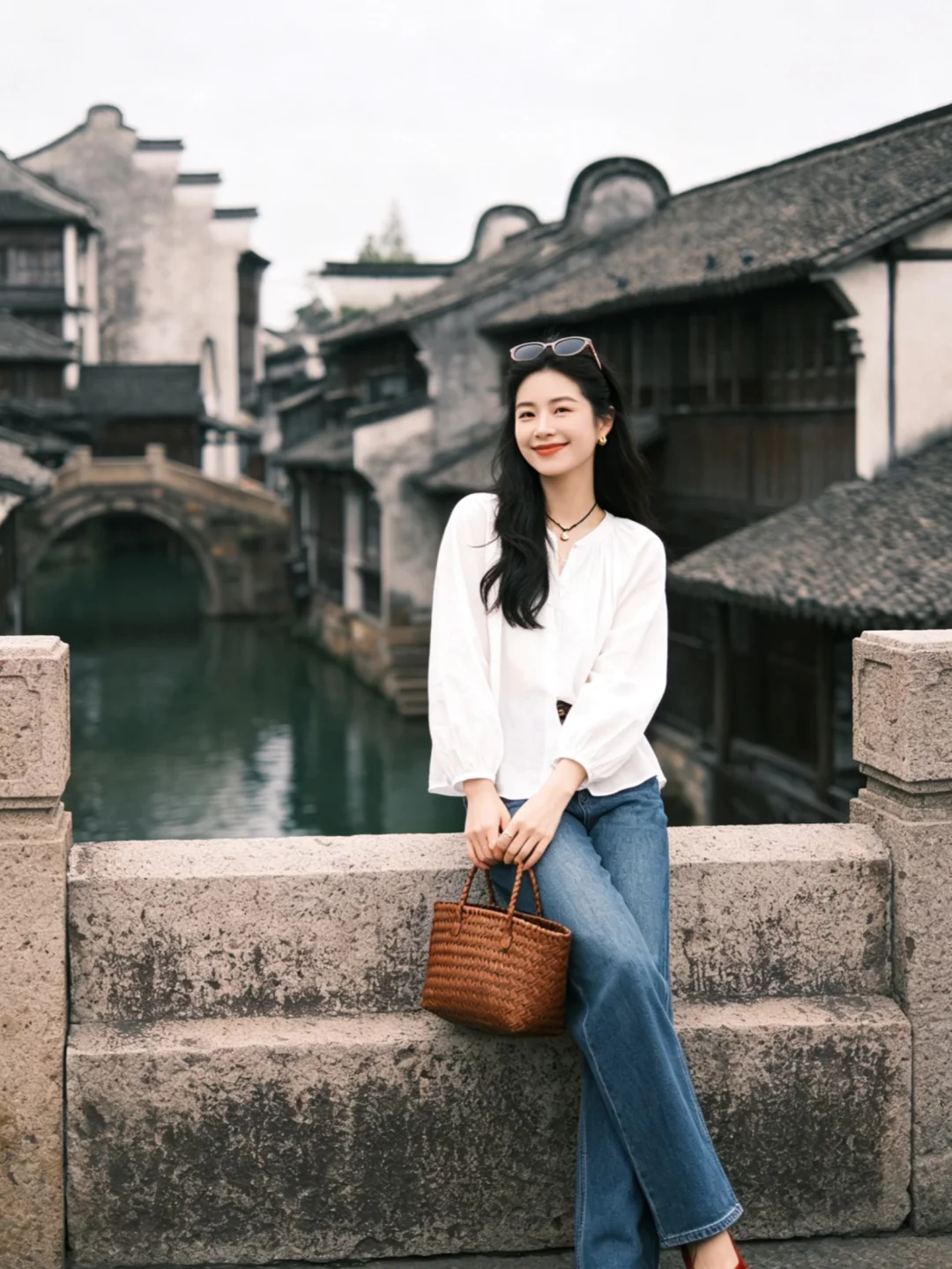 白衬衫穿搭 温柔穿搭风 白衬衫 清爽白色系穿搭 牛仔裤 古镇拍照 ootd穿搭 时髦衬衫穿搭 白色穿搭