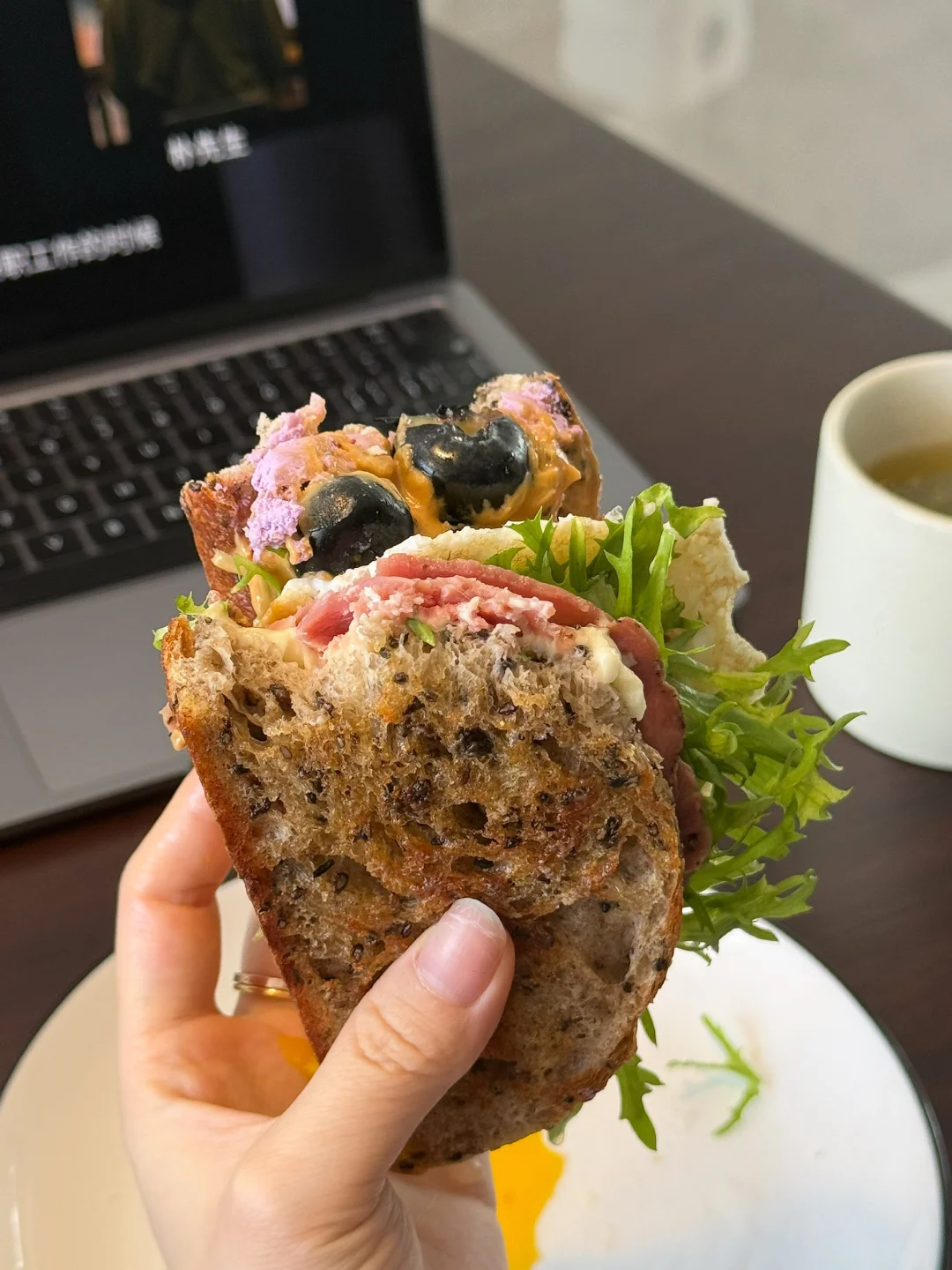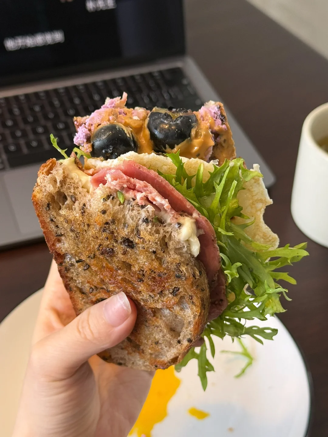 🥩黑胡椒牛梅花肉的肉质很嫩,但是每一口都是扎实的肉感!黑胡椒盐的咸香感衬托的三明治味道甜中带咸,超好吃!