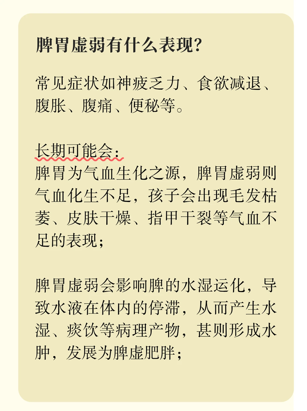 [打卡R]脾胃为气血生化之源,脾胃虚弱则气血化生不足,孩子会出现毛发枯萎、皮肤干燥、指甲干裂等气血不足的表现;[打卡R]脾胃虚弱会影响脾的水湿运化,导致水液在体内的停滞,从而产生水湿、痰饮等病理产物,甚则形成水肿,发展为脾虚肥胖;
