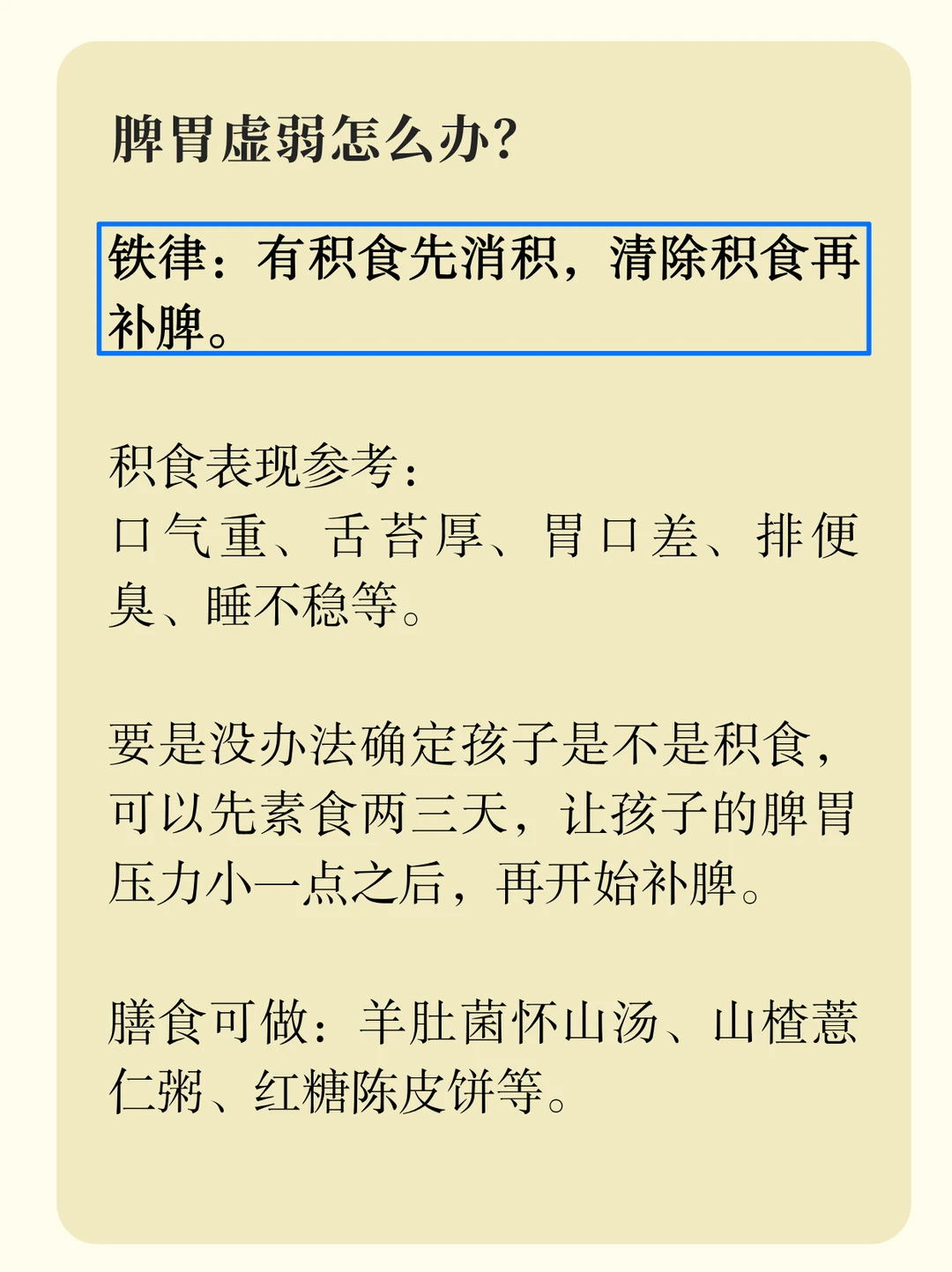 很多家长一听孩子脾胃虚弱了就要先补脾,这有些操之过急了。您想,孩子脾胃虚弱了,是不是吃下去的食物没人管了?因此,在补脾之前,先要确定孩子积没积食。