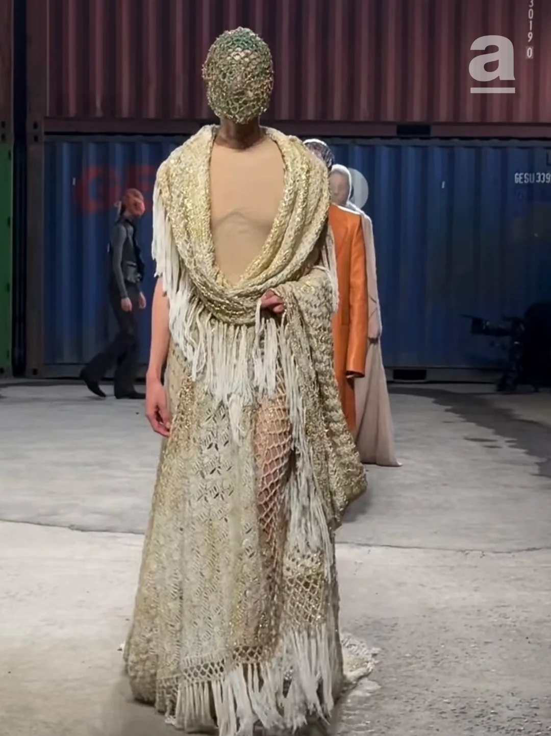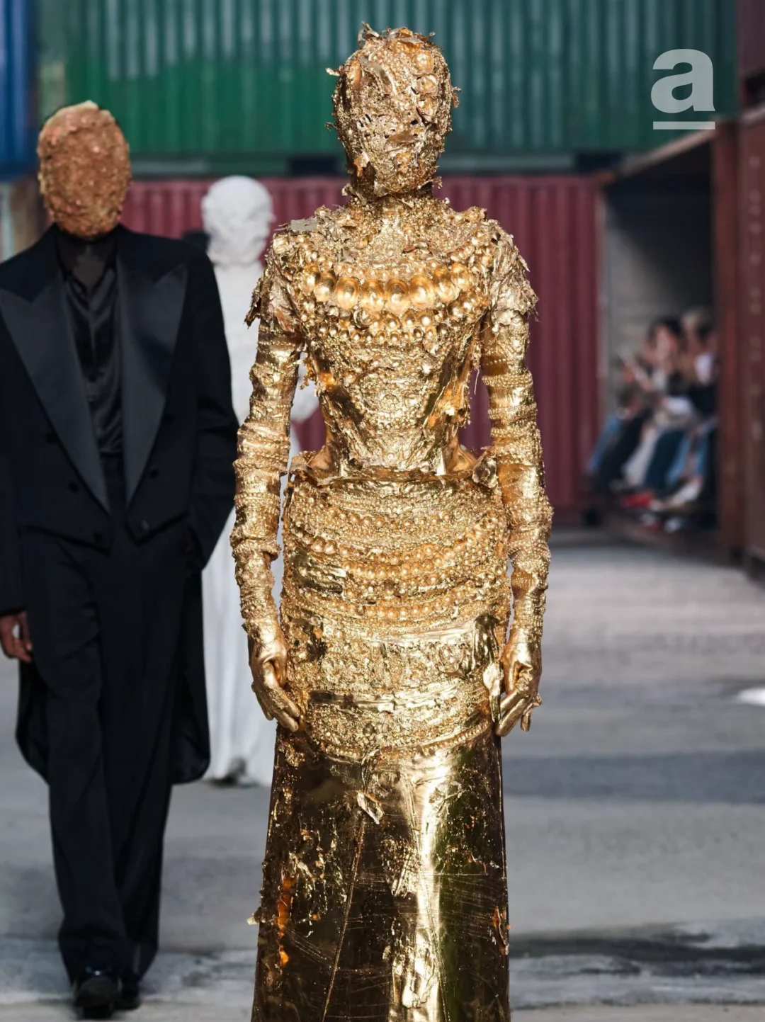传统上,面具的作用是切断观众对模特私人视角的凝视,将焦点转移到衣服本身而Martens将面具转化为整个造型的核心焦点,采用各种工艺呈现不同风格,成为一种炫技的成品,这种处理方式既延续了品牌的匿名性基因,又注入了强烈的视觉叙事性。