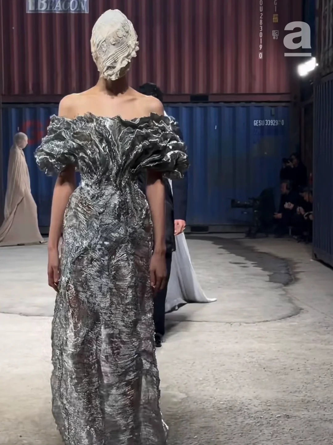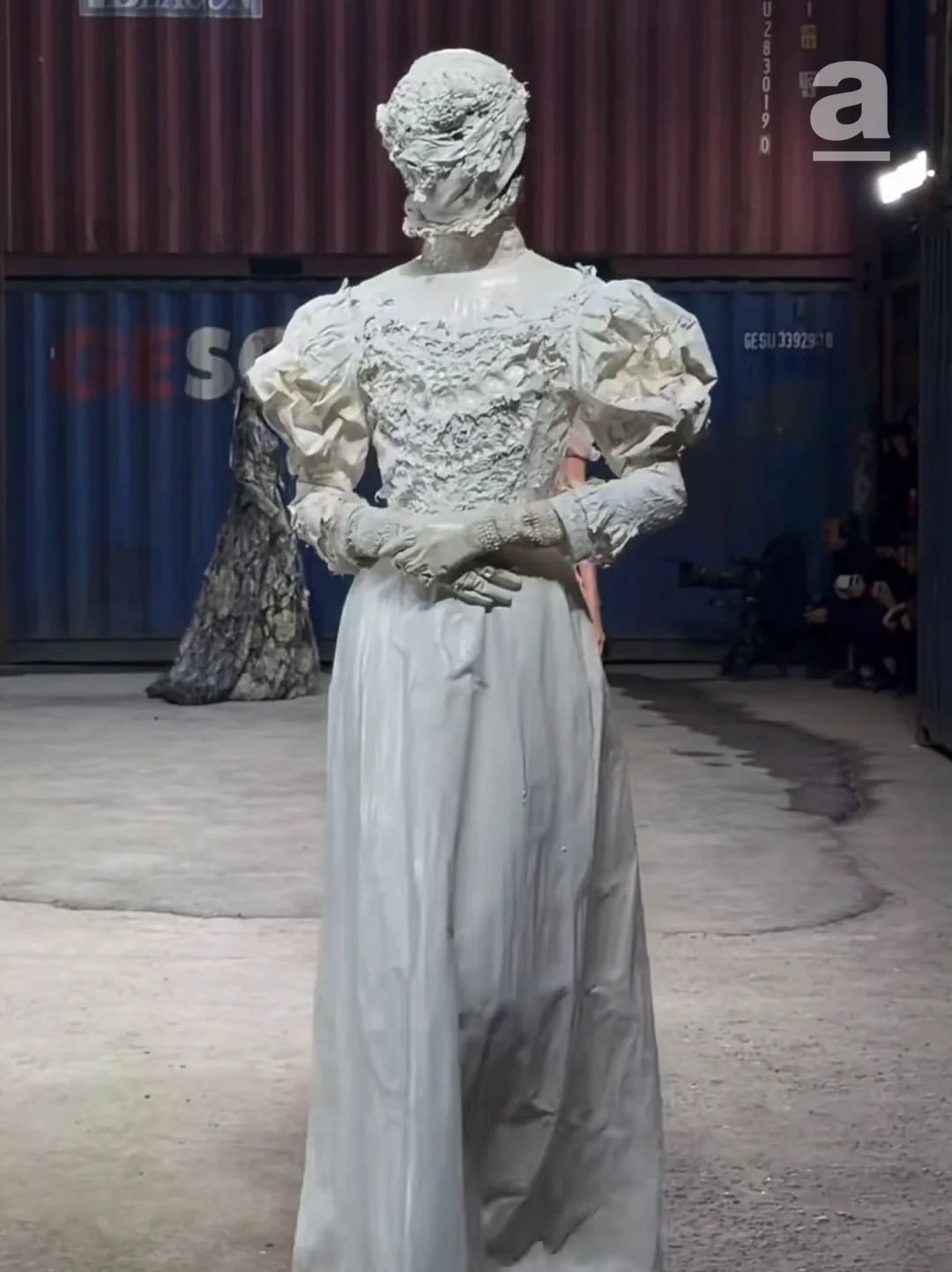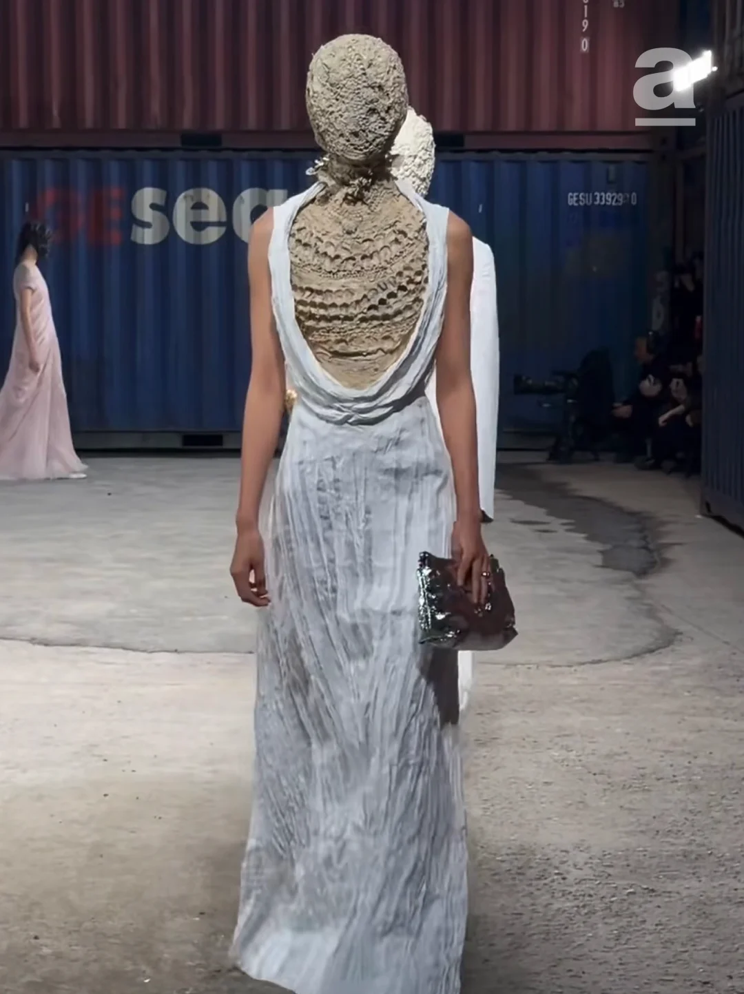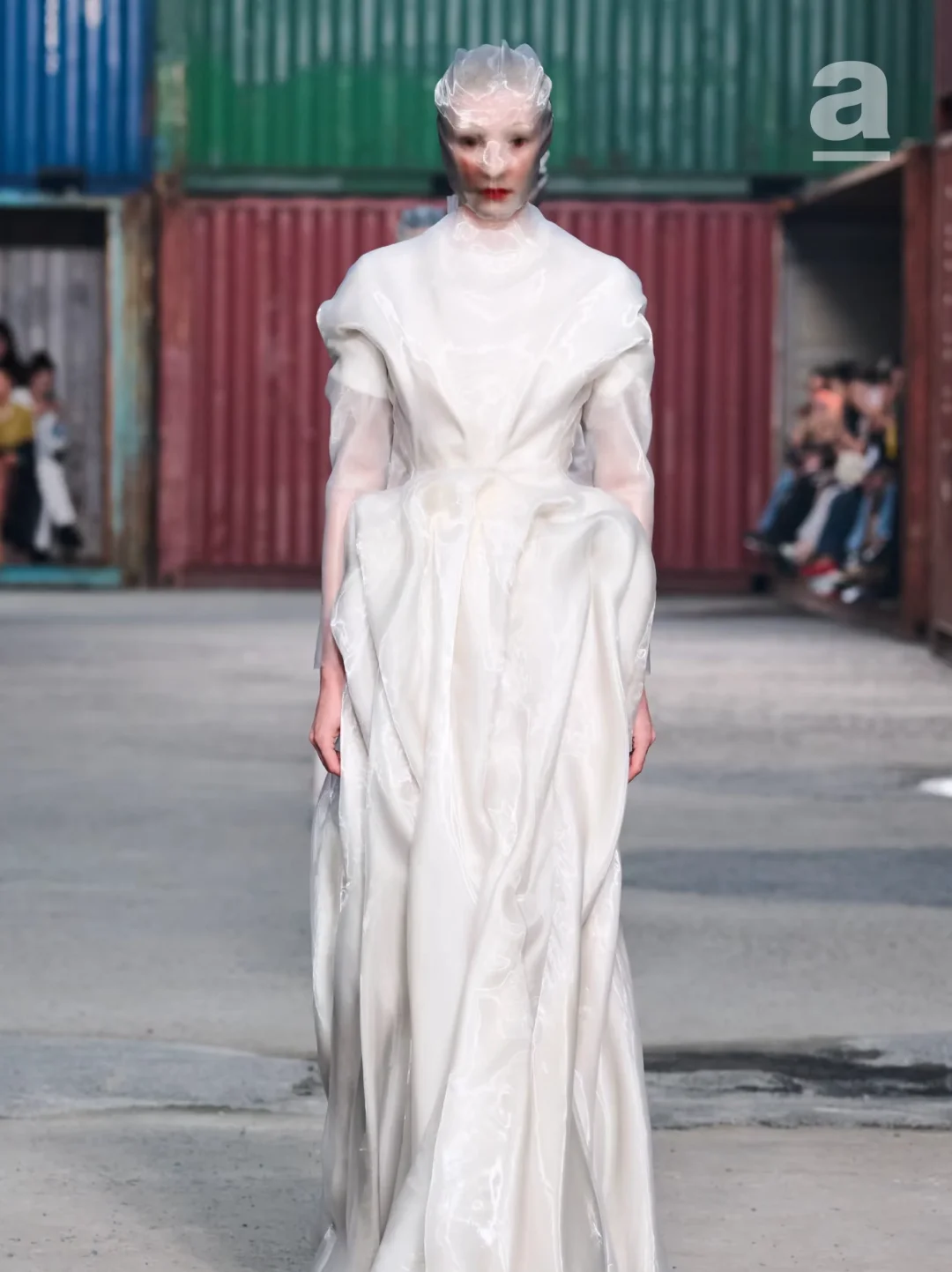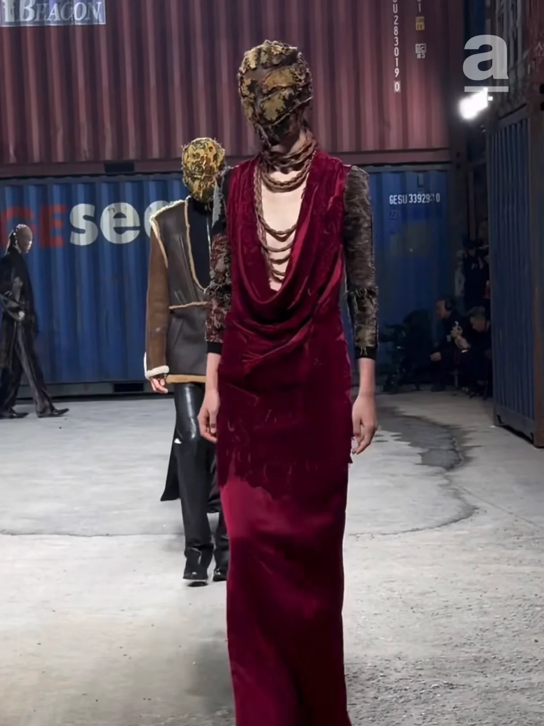 Glenn Martens将秀场选址在远离商业喧嚣的港口集装箱搬运中心,用最原始的工业元素构建了一个充满压迫感的超现实空间,巨大的集装箱矩阵被改造成来宾席位和迷宫般的通道,常年风吹日晒的水泥地成为秀道,模特们步履蹒跚的姿态反而冲淡了造型的隆重感,背景音乐选用Nick Cave和Kylie Minogue的《Where The Wild Roses Grow》,这首充满黑暗阴郁、谋杀与绝望浪漫主义的民谣,为整场秀奠定了邪典电影般的视听基调。