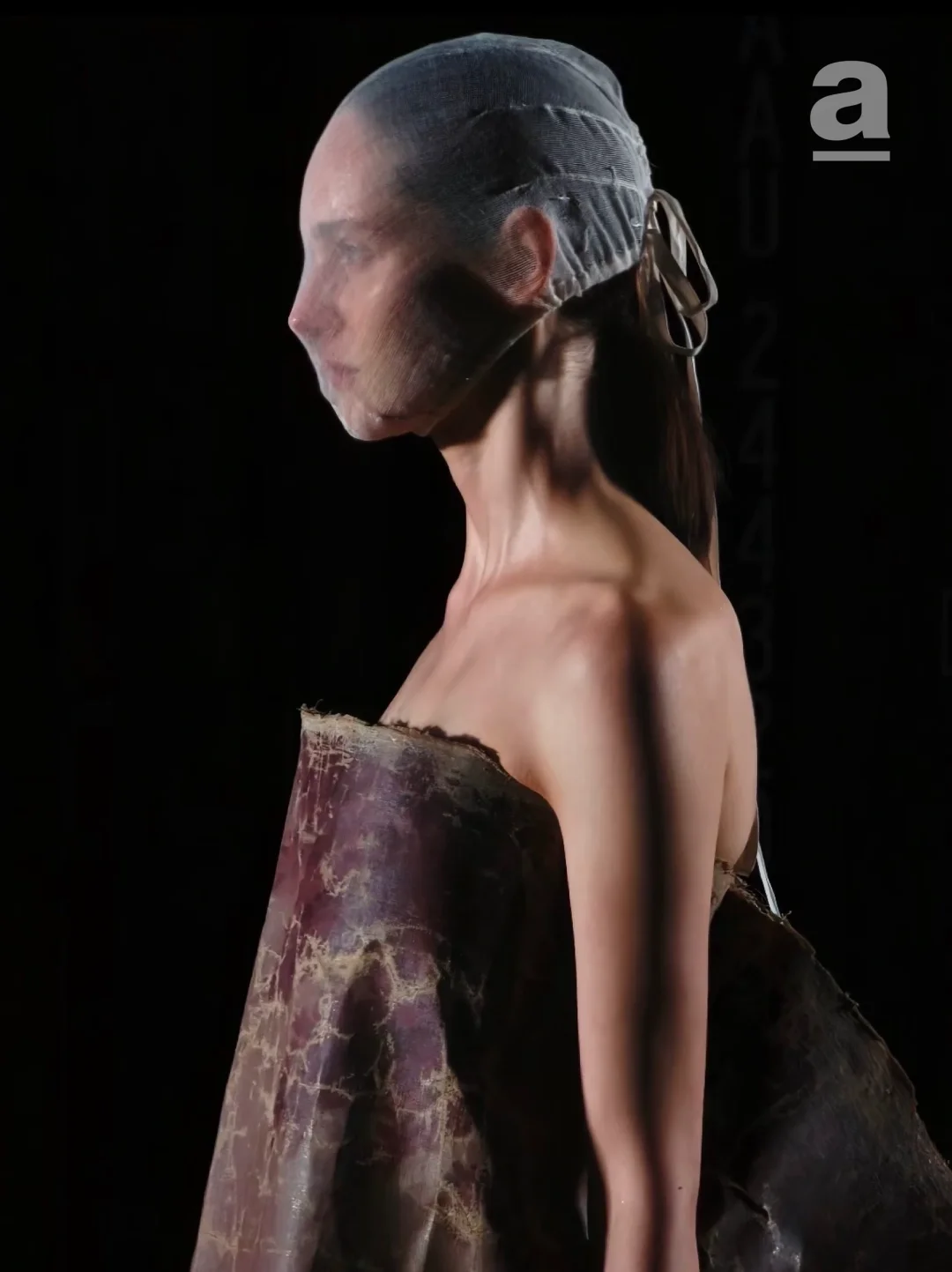 本季大秀首次将Artisanal高级定制系列与成衣系列合并发布,呼应了品牌创立初期的发布形式。Glenn Martens以"再造"与"时间"为核心线索,对品牌经典档案进行了大胆的当代演绎。