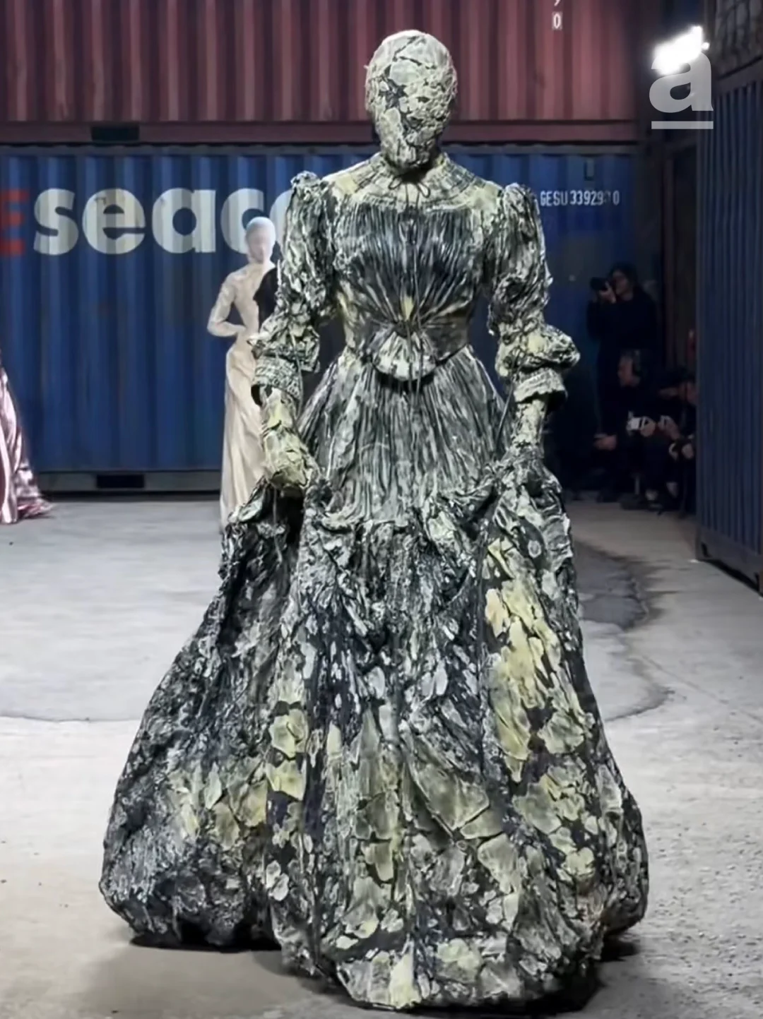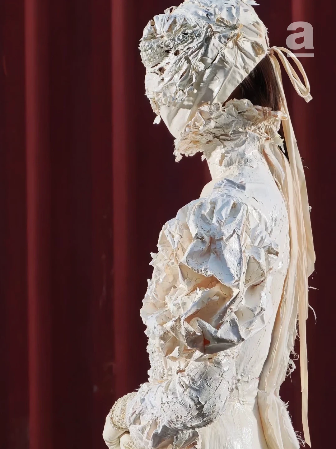 与Martin Margiela时代强调的粗粝手工感不同,Martens先将瓷片与衬布贴合,再完整压碎成不规则姿态,瓷片裙装沉重且行走时会继续碎裂,始终维持在一种"未完成状态",成为"时间痕迹"的绝佳隐喻。