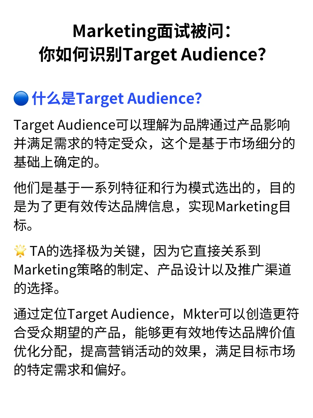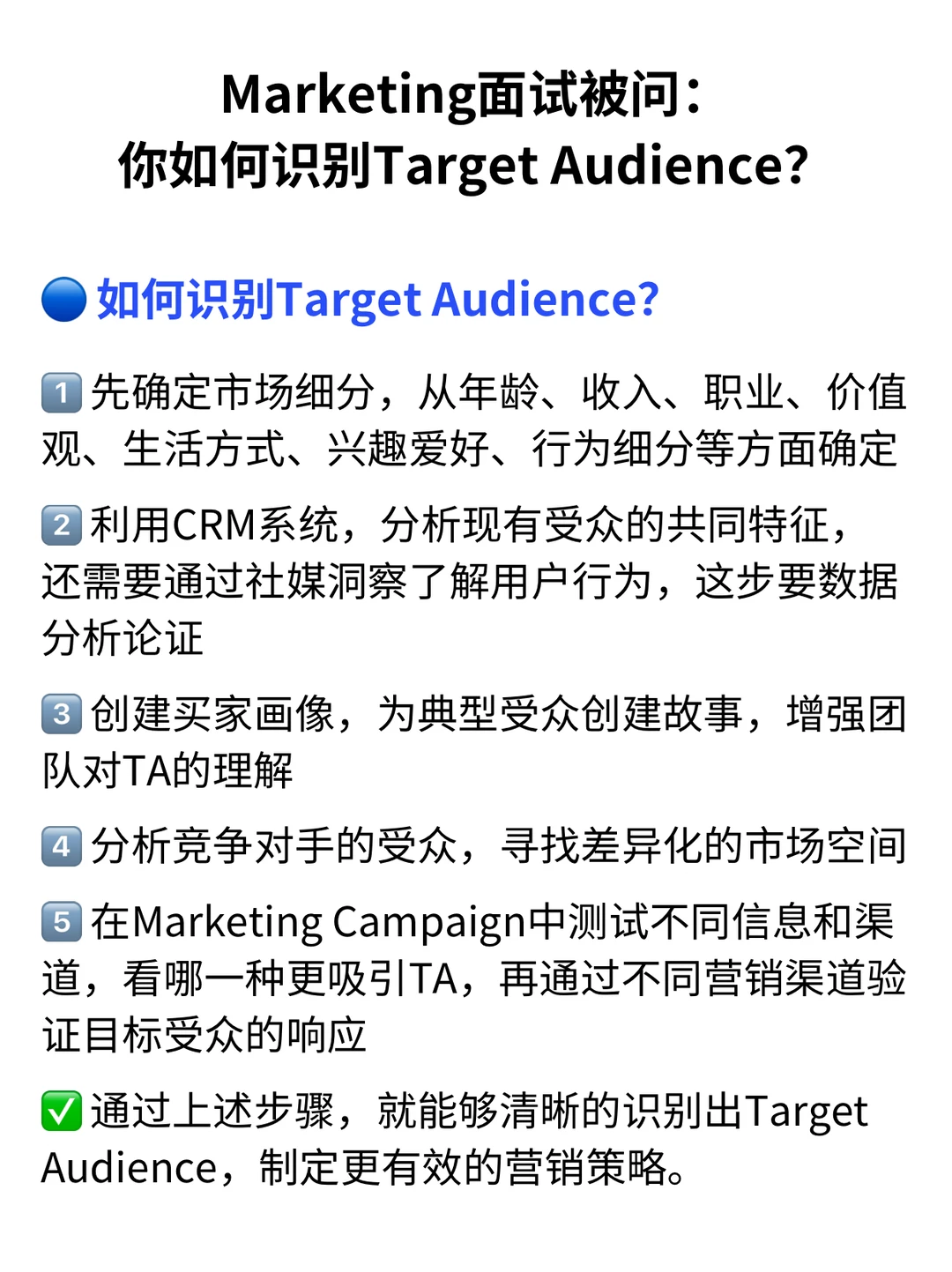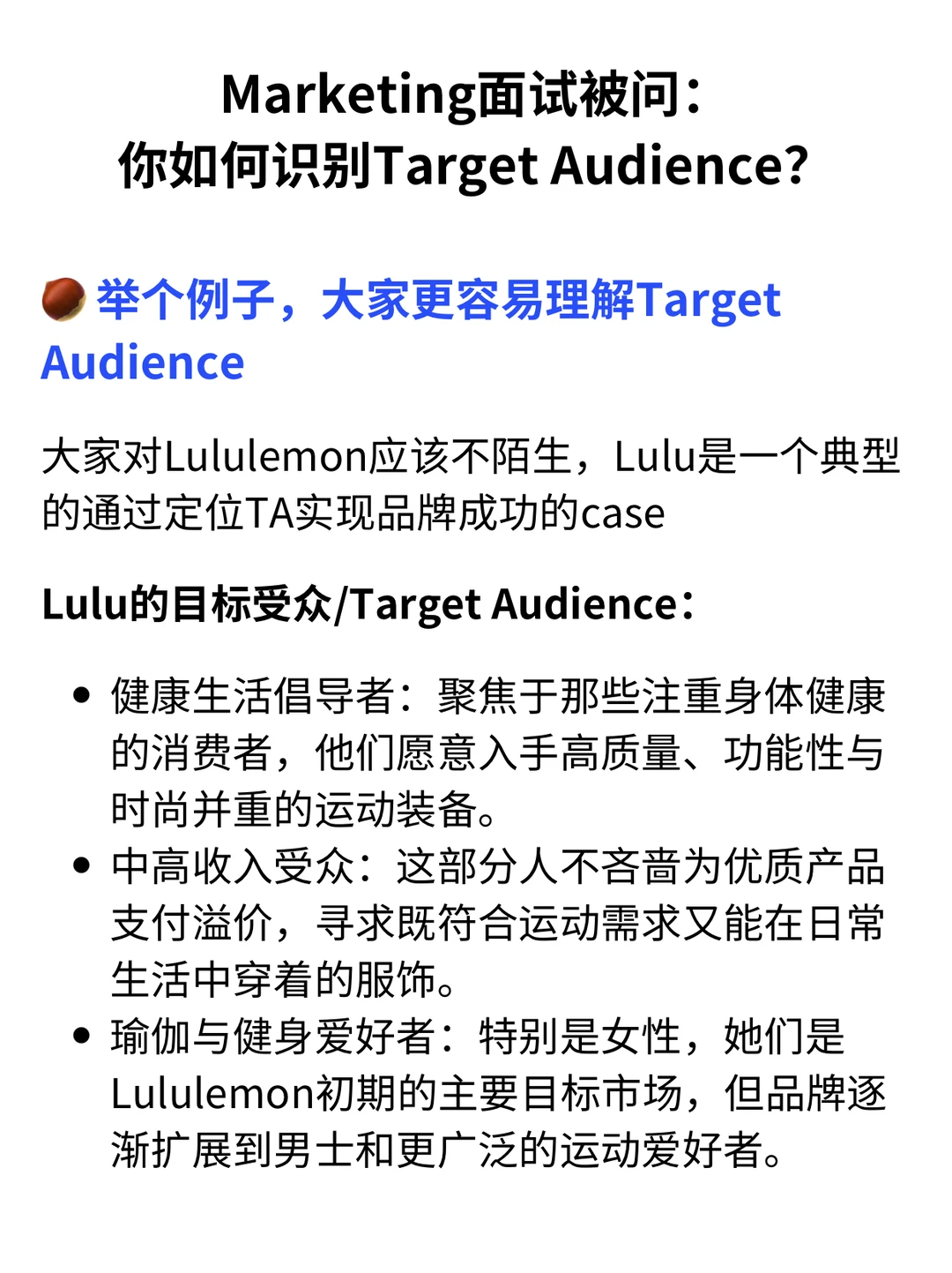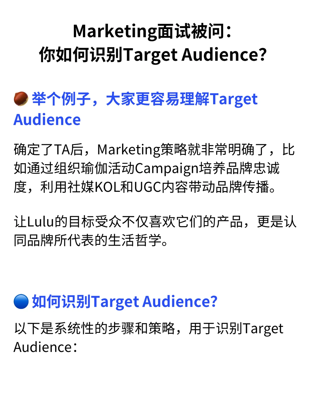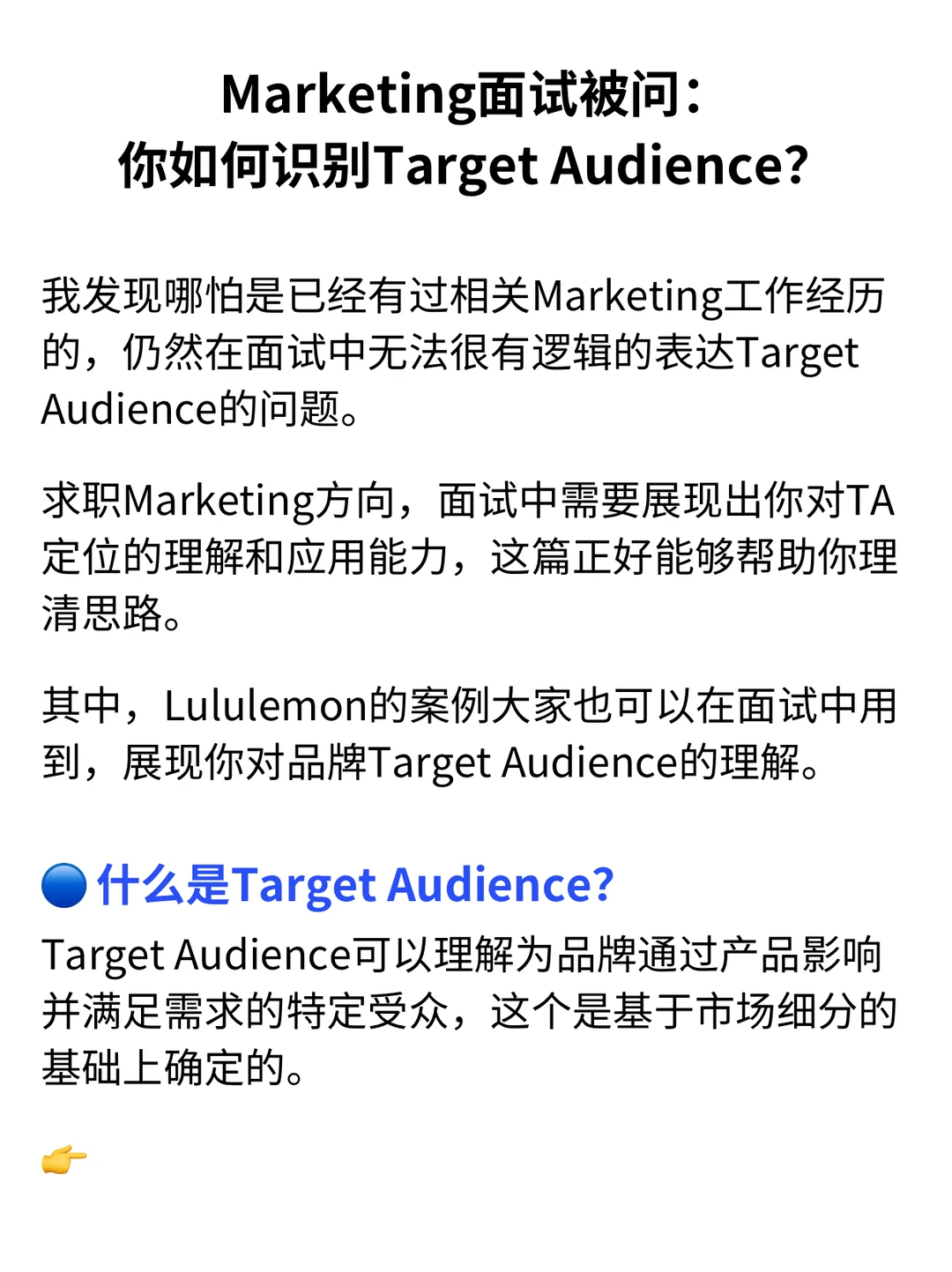 我是瑞池,500强外企业务团队Senior Manager · 在Marketing面试中,“如何找到Target Audience”几乎是高频面试问题,许多人即使有工作经验,也常常在这个问题表达的不好 · 这篇正好详细讲解拆解目标受众定位的核心方法论,帮助大家面试准备 · 一、什么是Target Audience? - Target Audience可以理解为品牌通过其产品或服务能够影响并满足需求的特定人群 - TA的选择很重要,因为它直接决定了Marketing策略的方向、产品定位以及推广渠道的选择 - 精准的目标受众定位能够帮助营销人员更有效地传达品牌价值 - 优化资源分配,提高营销活动的针对性和效果,更好满足目标市场的特定需求和偏好 · 🌰 举个例子,大家更容易理解Target Audience 大家对Lululemon应该不陌生,Lulu是一个典型的通过定位TA实现品牌成功的case Lulu的目标受众/Target Audience(具体👀见图‼️) · 二、如何识别Target Audience? 大家面试要按照这个系统性的「步骤和策略」回答(具体👀见图‼️) · 🙋‍♂️(求职版) Hi~ 我是瑞池,500强外企面试官,每日分享求职干货 -