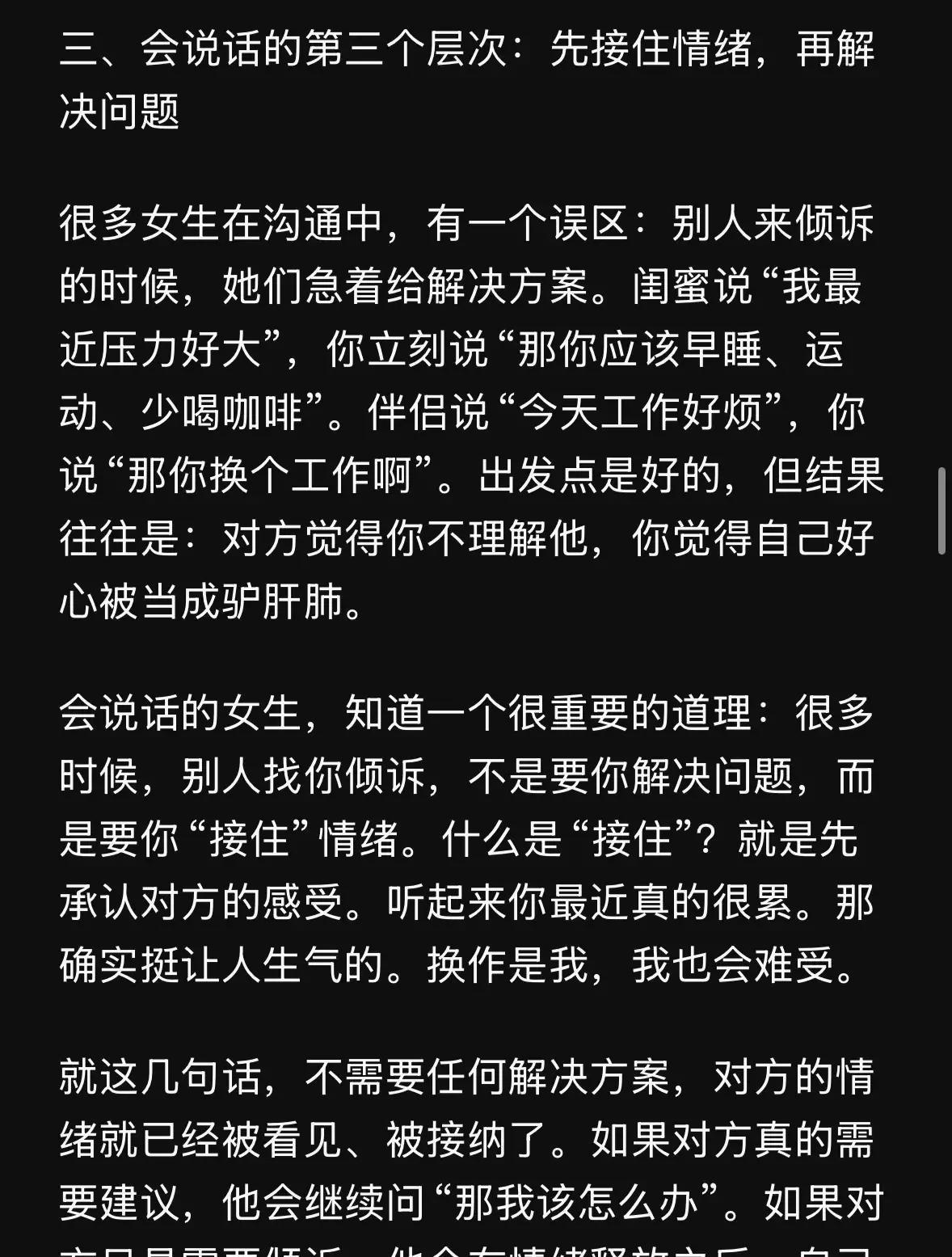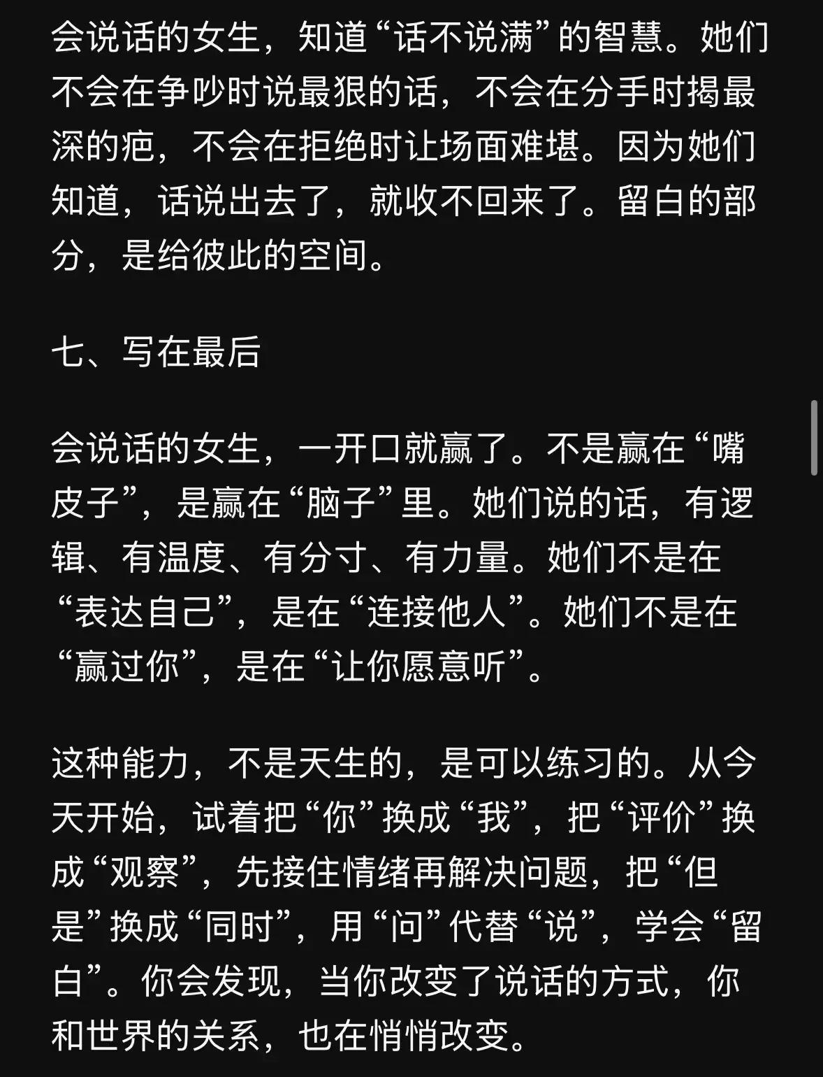 为什么有些女生开口瞬间圈粉无数,却不是靠吵闹取胜? 这背后藏着沟通的秘密武器。 她们的话语总带着逻辑清晰的脉络,让听者瞬间跟上思路,避免了常见的混乱误解。 不是简单陈述事实,而是层层递进,引导对方自然接受观点。 根据2023年LinkedIn全球职场报告,具备这种逻辑表达能力的女性,在团队协作中影响力提升高达35%。 这不是天赋,而是通过日常积累形成的习惯,帮助她们在复杂环境中脱颖而出。 更关键的是话语里的温度感,像一股暖流,融化了人际的冰层。 她们懂得用共情回应,而不是冷冰冰的反驳,这让对话从对抗转为合作。 对比那些只顾争辩的交流,这种方式往往化解冲突更快。 2024年哈佛大学的一项沟通研究显示,注入情感温度的对话,能提高关系满意度25%以上,尤其在女性主导的场景中。 还有分寸的把握,避免越界,却总能触及人心最软的地方。 力量感则源于内心的从容,不需高声,就能让对方心甘情愿倾听。 本质上,这种说话不是为了压倒别人,而是构建桥梁,连接彼此的世界。 挖掘深层规律,会发现它源于情感智能的核心:懂得读懂人心,方能在社交中长久获胜。 职场或生活中,这种女生往往形成更稳固的支持网络,远超表面强势的表达。 每句精心的话语,都在悄然积累个人魅力