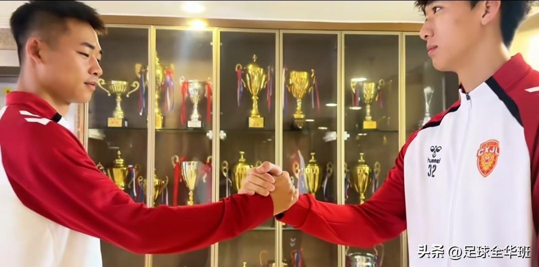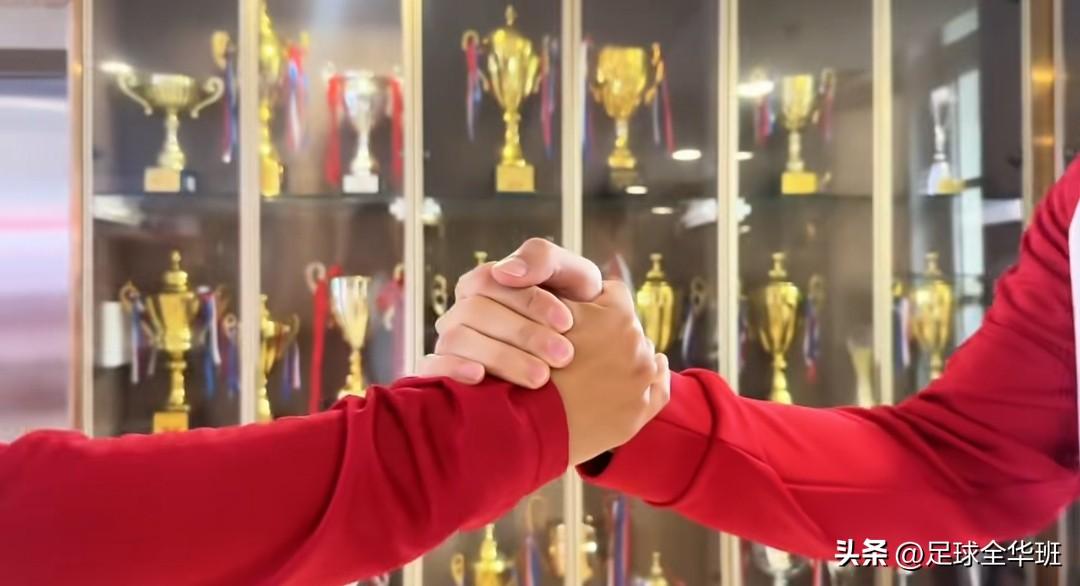 视频一开始,一位身穿“恒大足校学校”标志的球员在荣誉室附身仔细观看展览的合照,后面来了一位身穿白色且印着“CXJL”广东晨星聚力俱乐部logo的球员,接着两人握手,足校球员瞬间也穿上了俱乐部衣服。很明显寓意着这次是足校球员和“回家”球员一起组成球队。