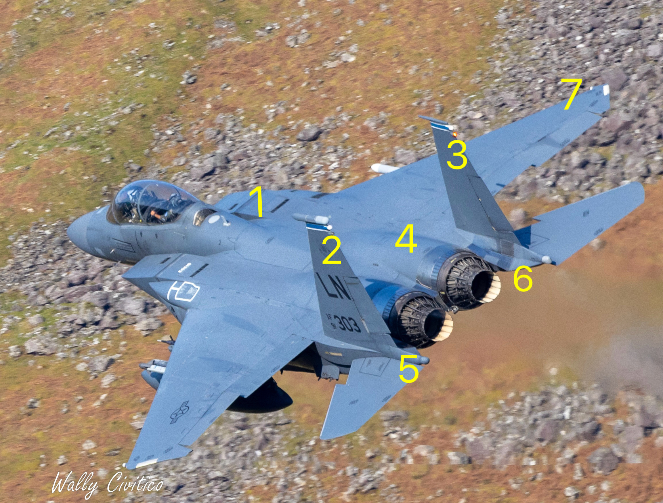 我来标注一下我能辨认的几块残骸在飞机上是什么部位:1. 进气道上表面可翻动的盖板2. 左侧垂尾翼尖3. 右侧垂尾翼尖(注意受损情况明显不同于2)4. 发动机涡轮盘5. 左侧尾椎6. 右侧尾椎7. 翼尖编队灯