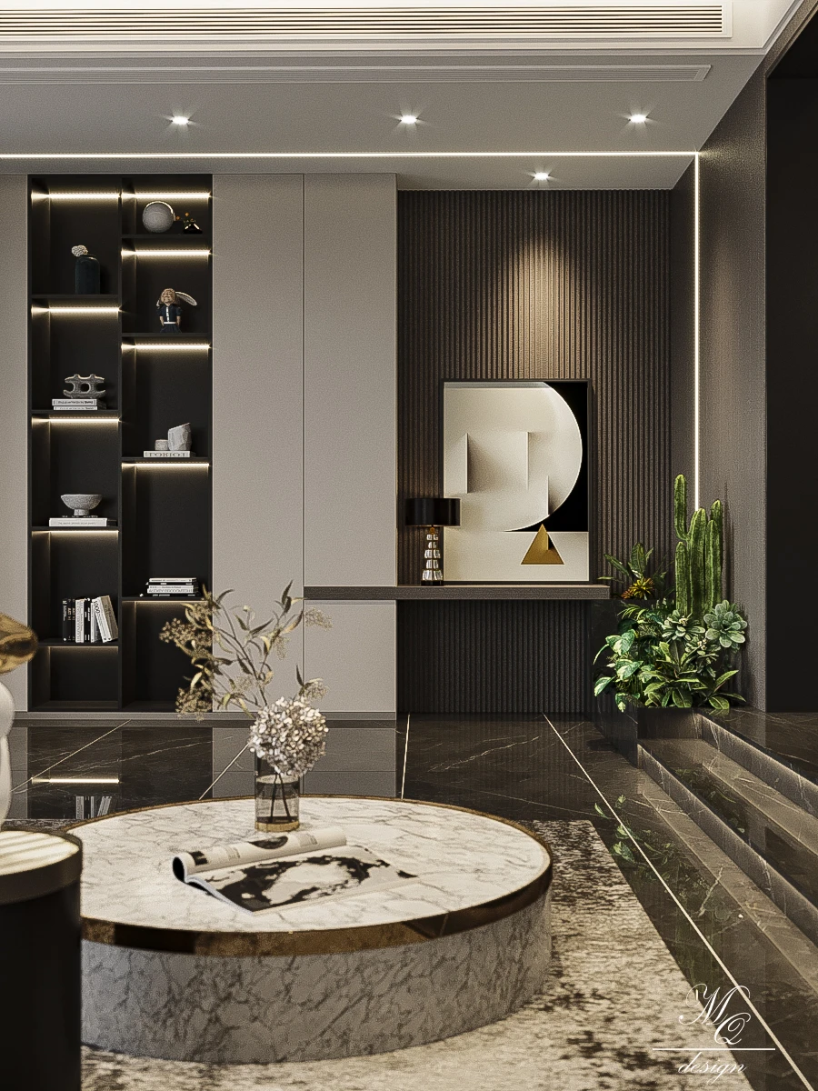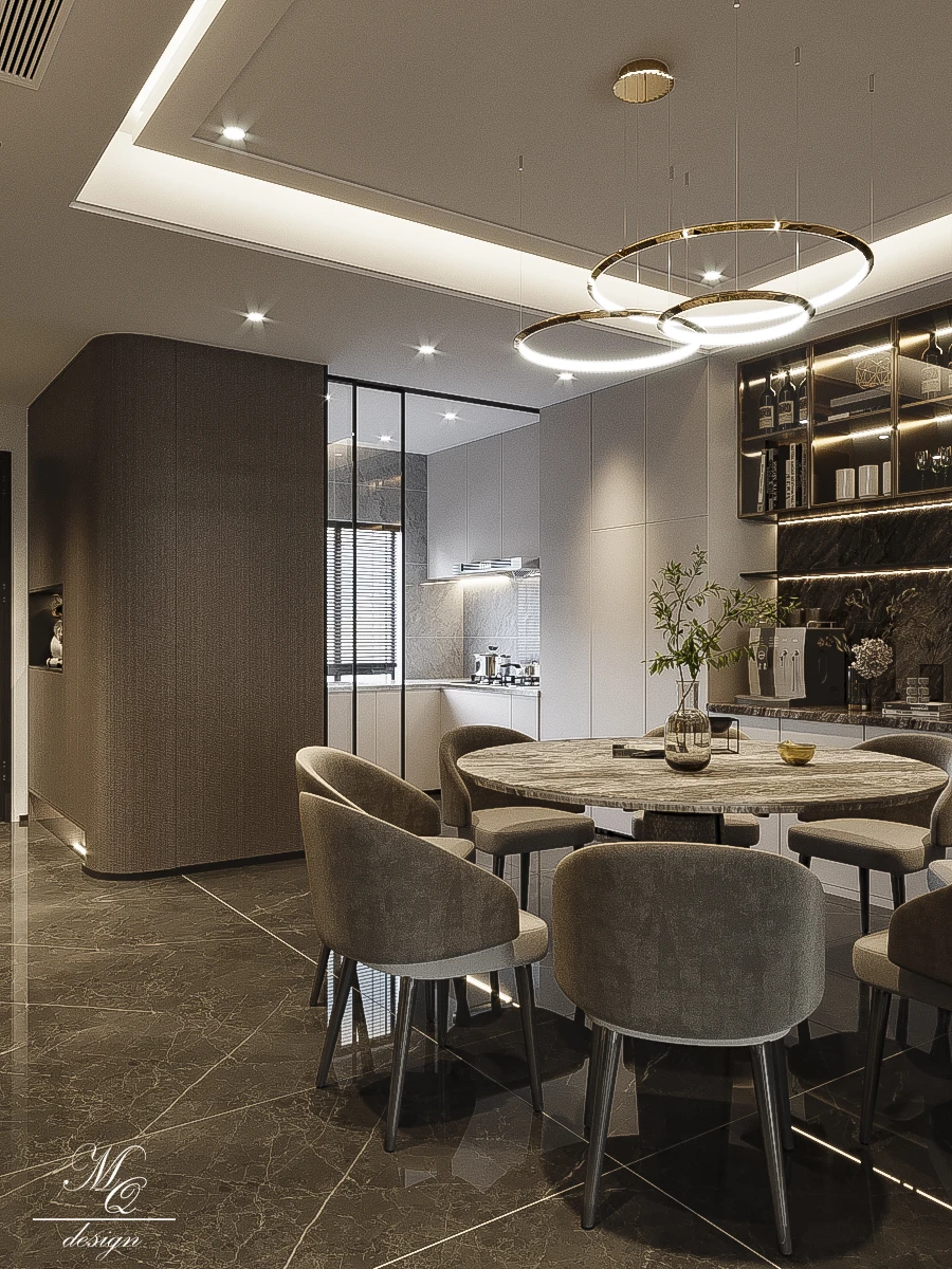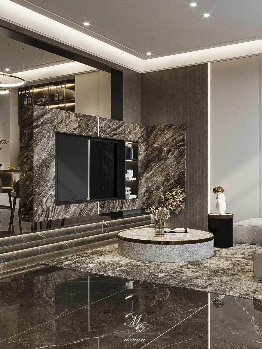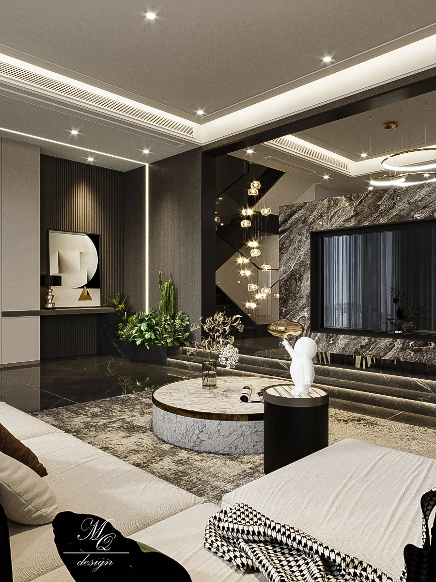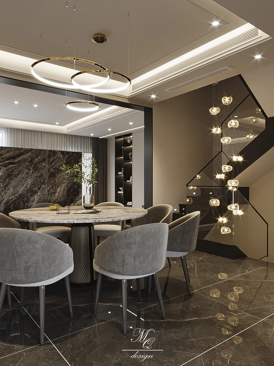 现代轻奢风客餐厅设计 别墅设计悬挑电视背景 开放的客餐厅空间 开阔