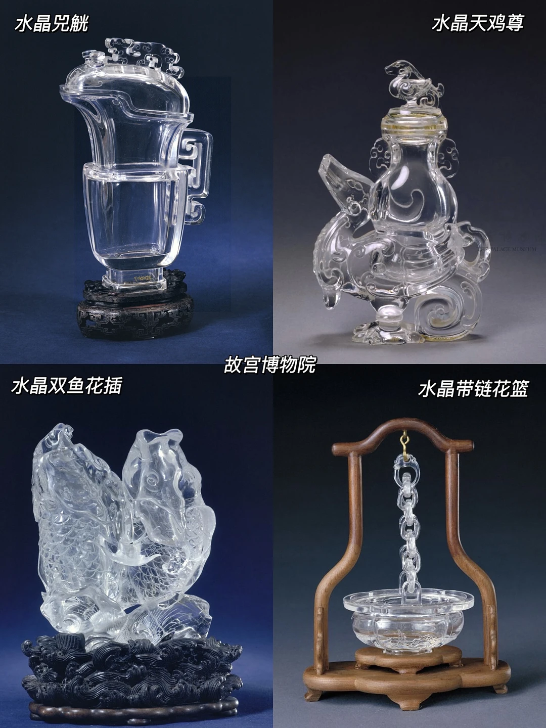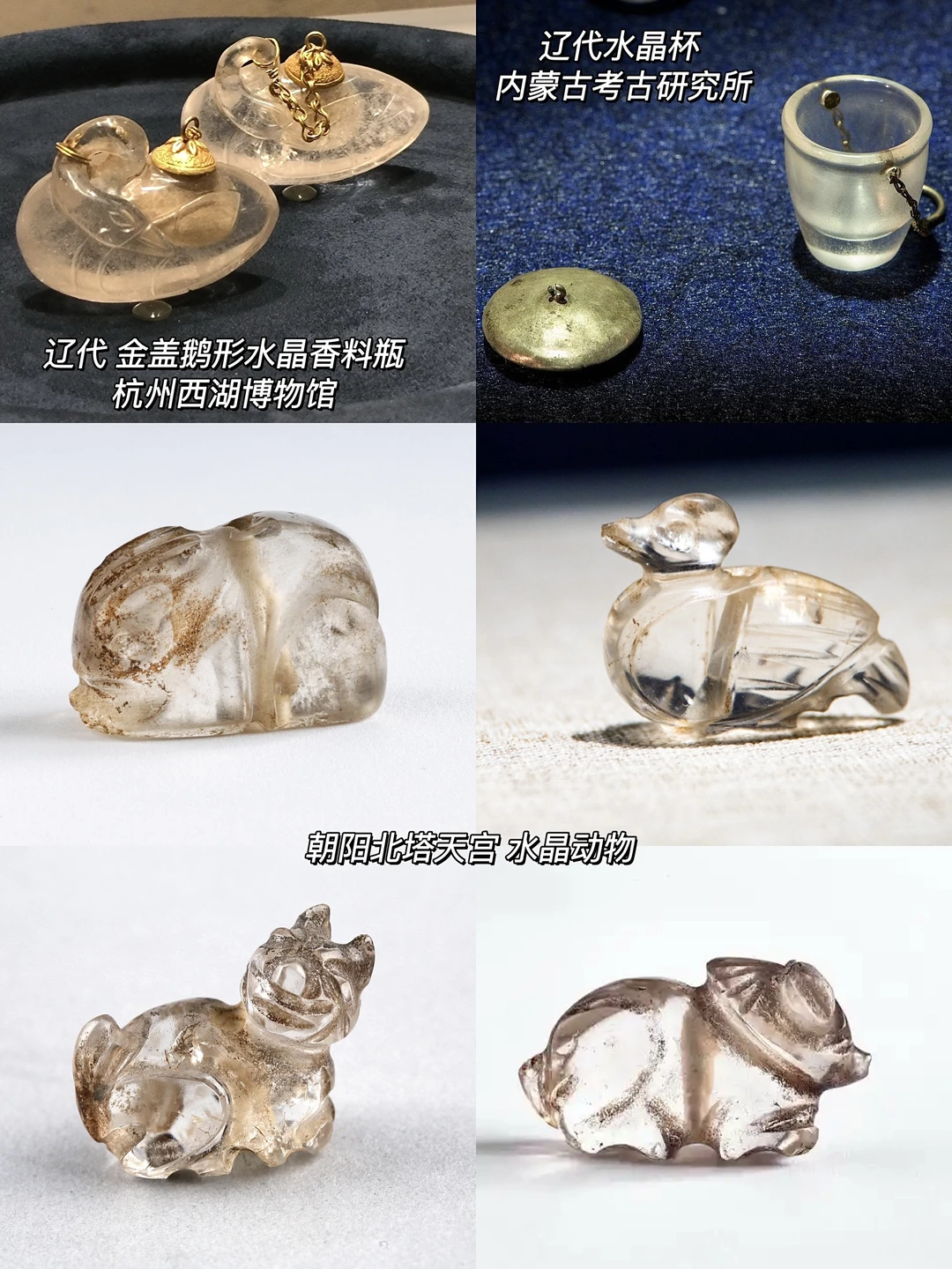 🔮辽代的水晶装饰多了许多包金的设计,还有一些生动可爱的动物水晶,像是龟鱼、鸭鹅、熊、老鼠等等,展示出工匠超高的圆雕技法。