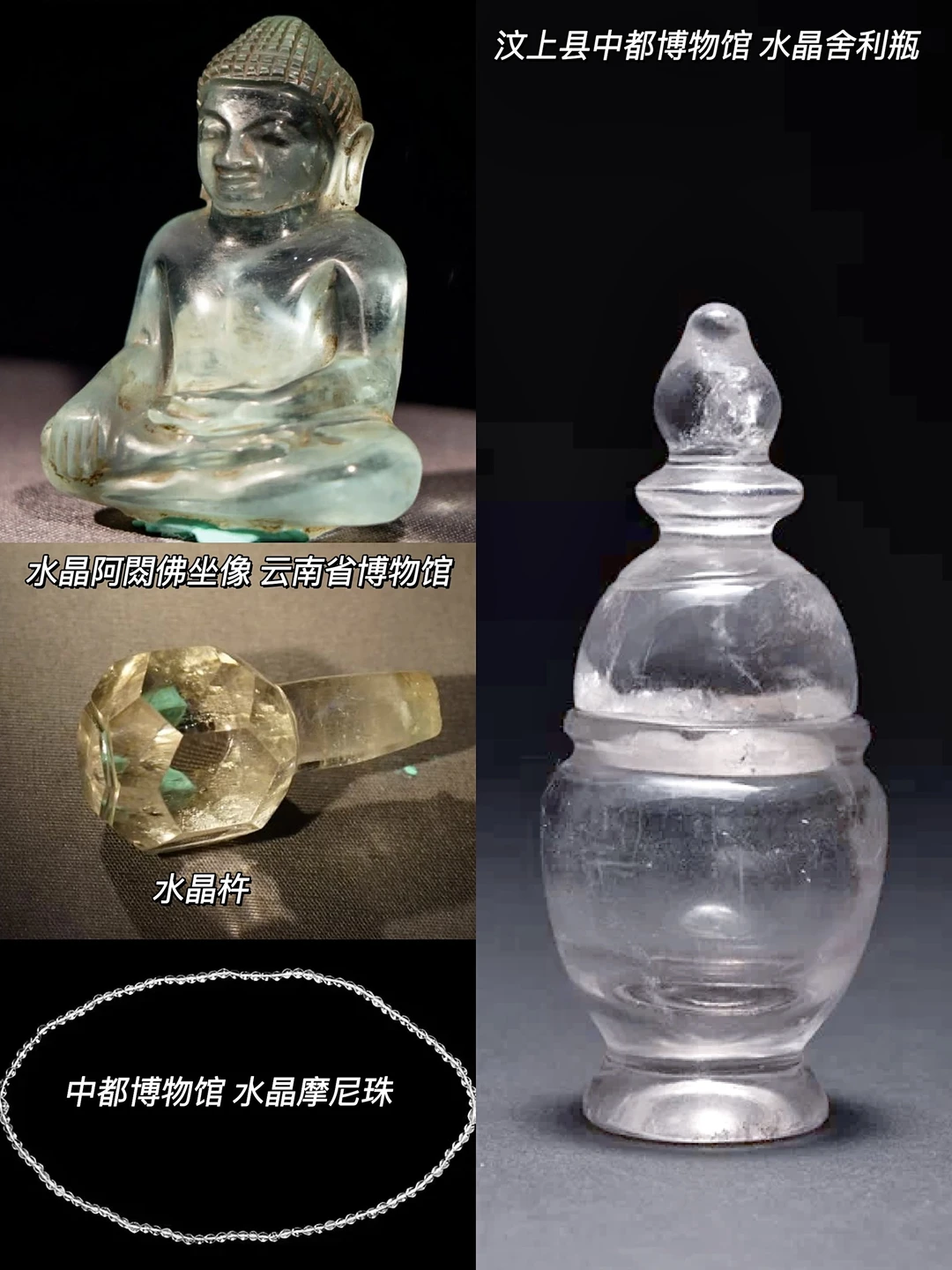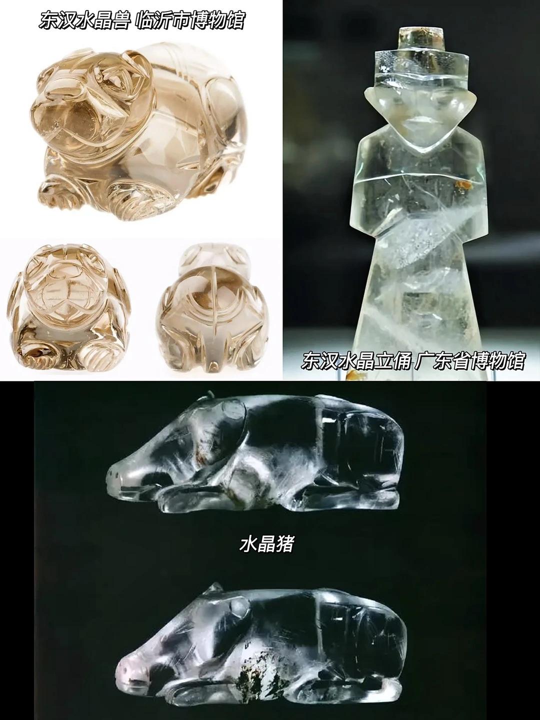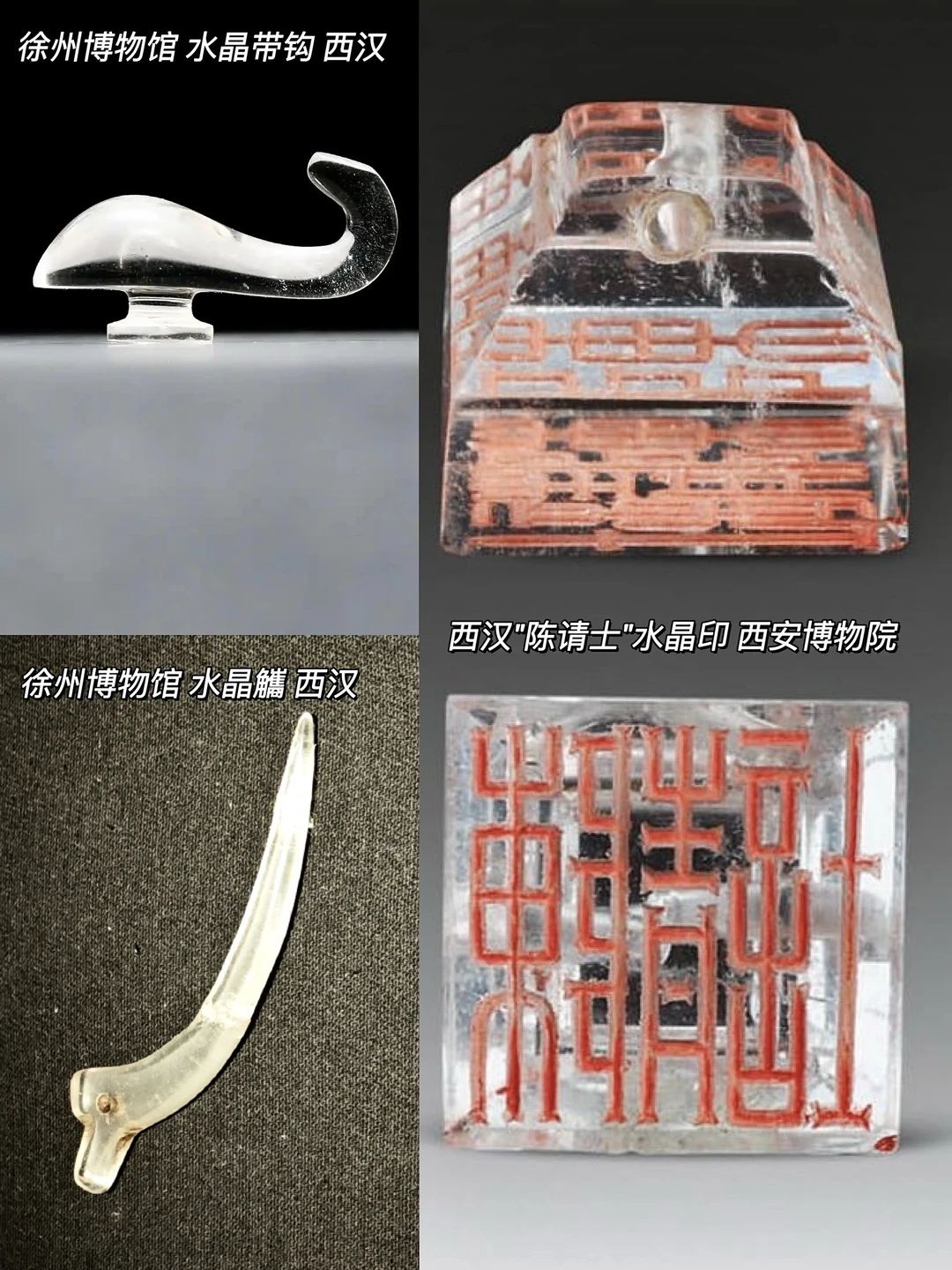 🔮从两汉开始,水晶的种类开始变多,比如现藏西安博物院的水晶印、来自徐州博物馆的水晶带钩(腰带挂钩)、水晶觿(揭开绳索的工具),以及东汉时期出现的水晶兽、水晶猪、水晶立俑等等。