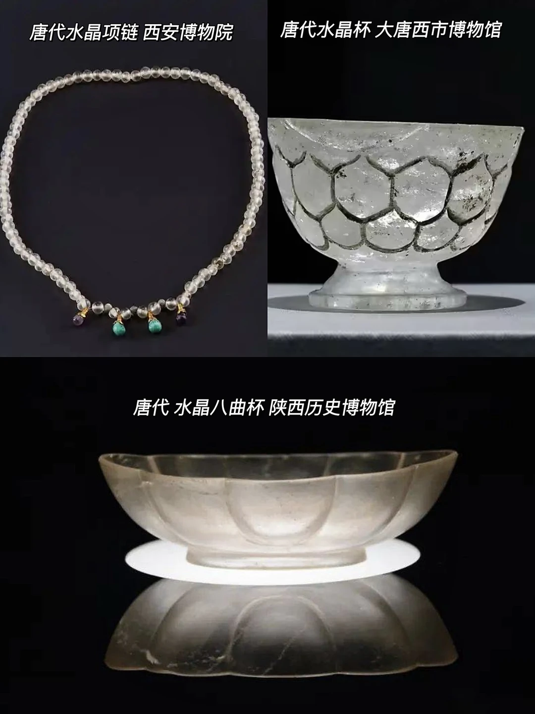 唐代水晶一方面受到了外来影响,出现了有着萨珊王朝影子的水晶八曲杯和带有中亚风格印记的水晶项链。