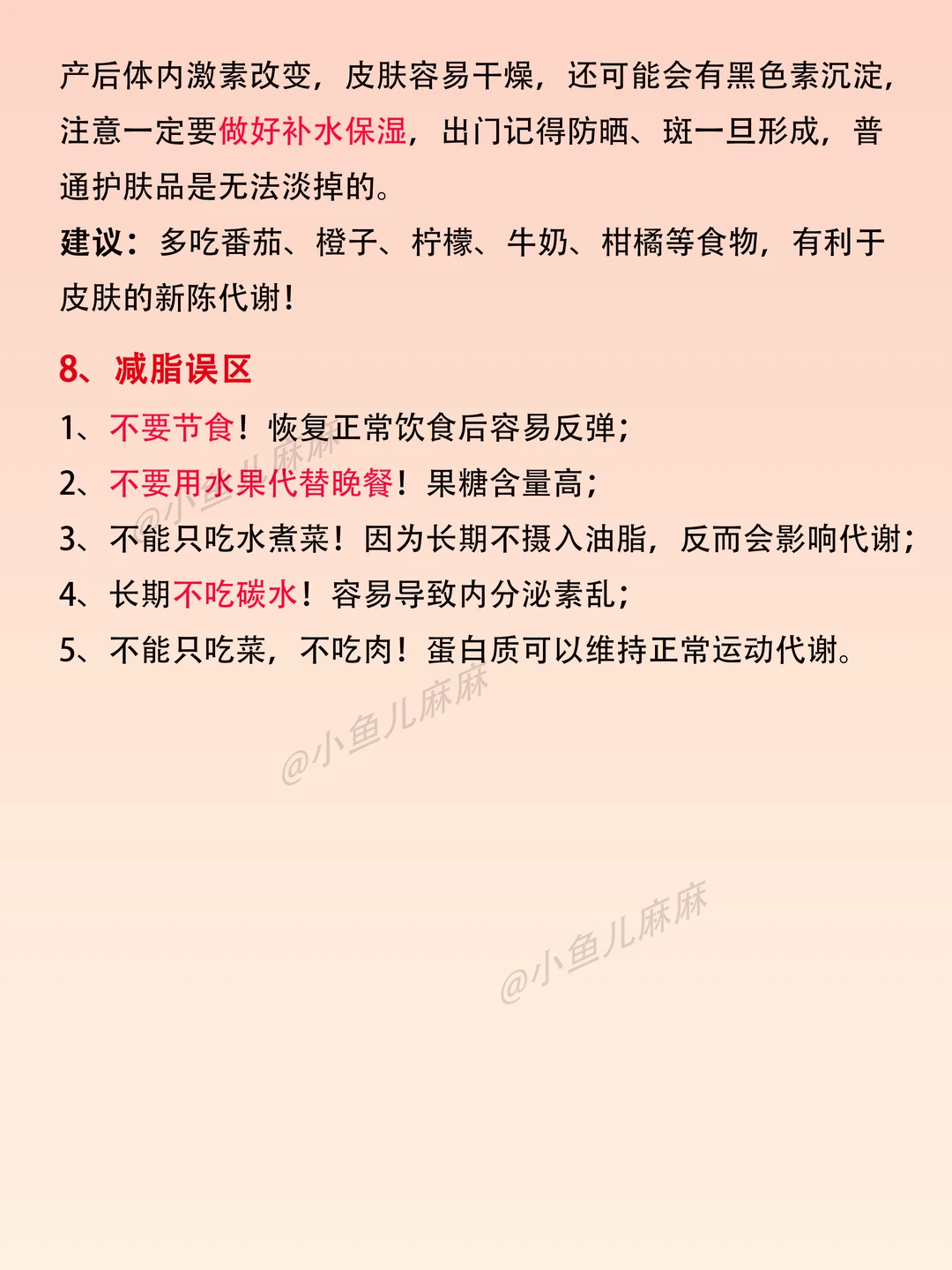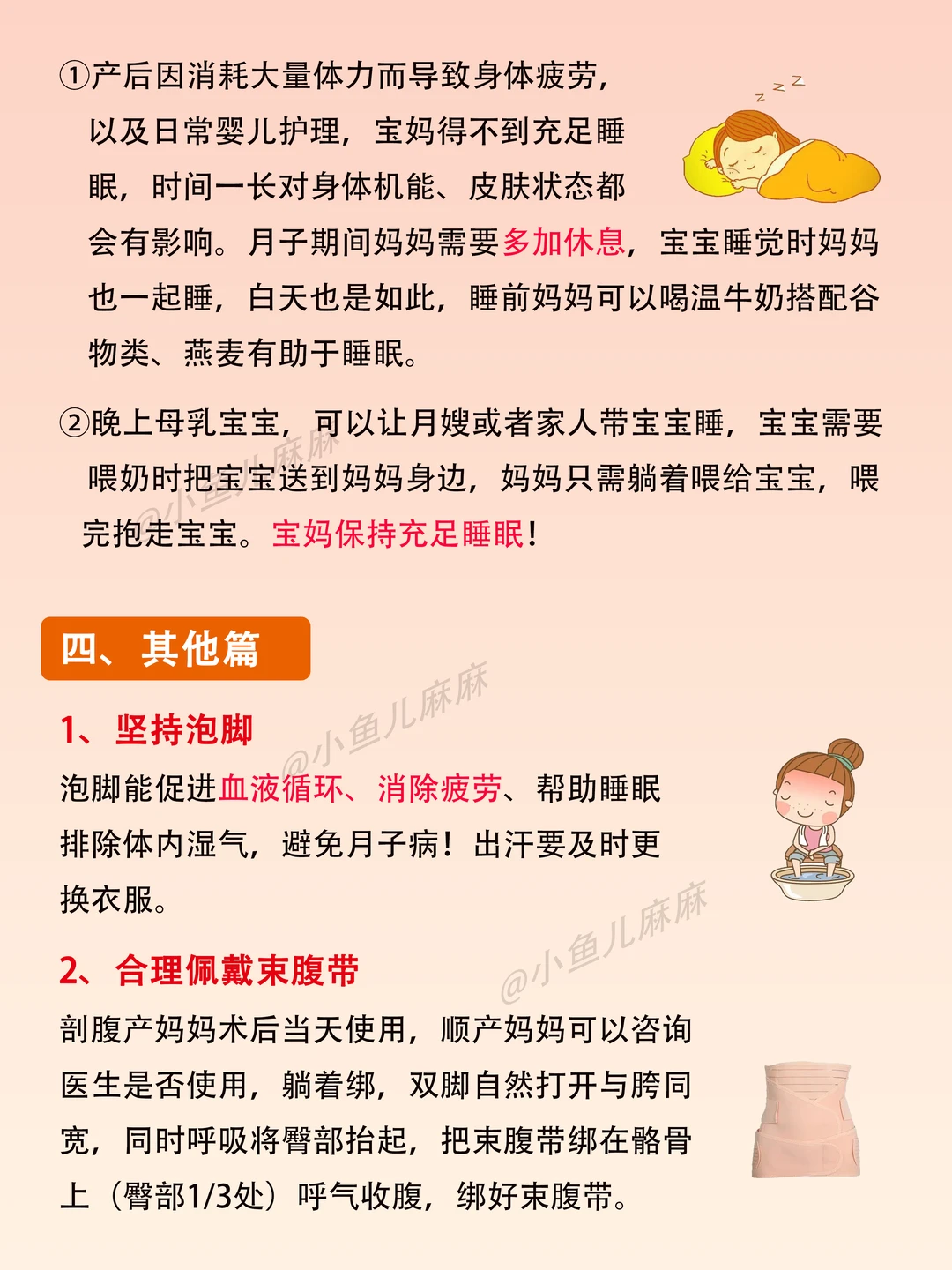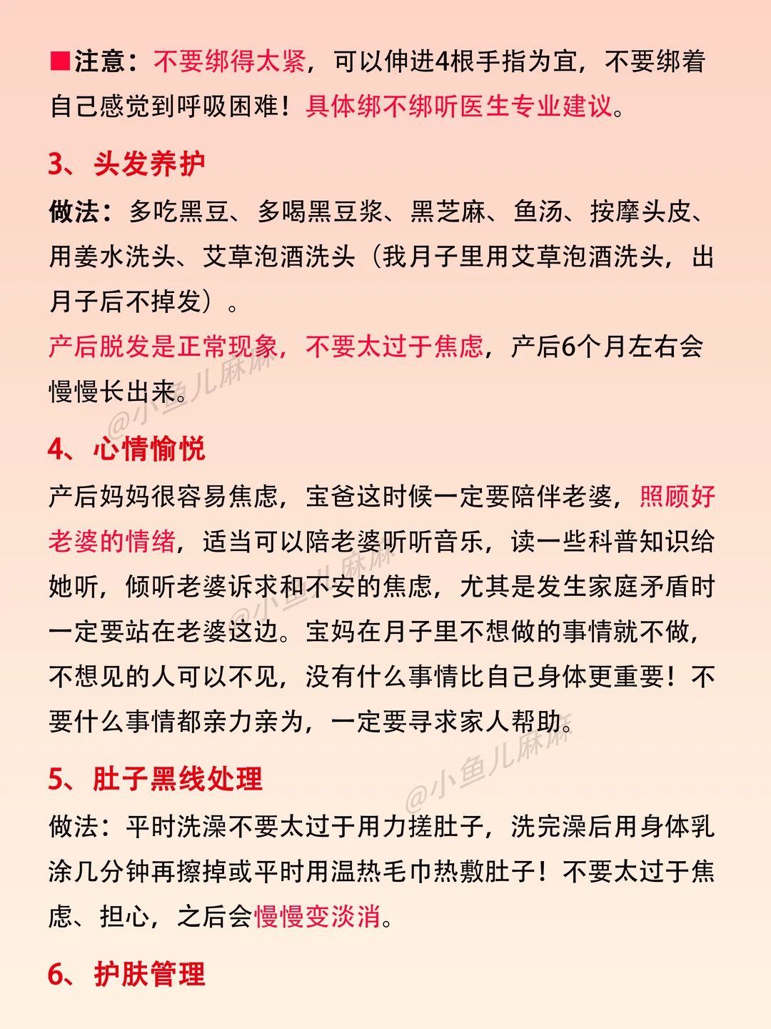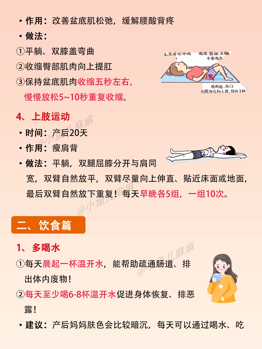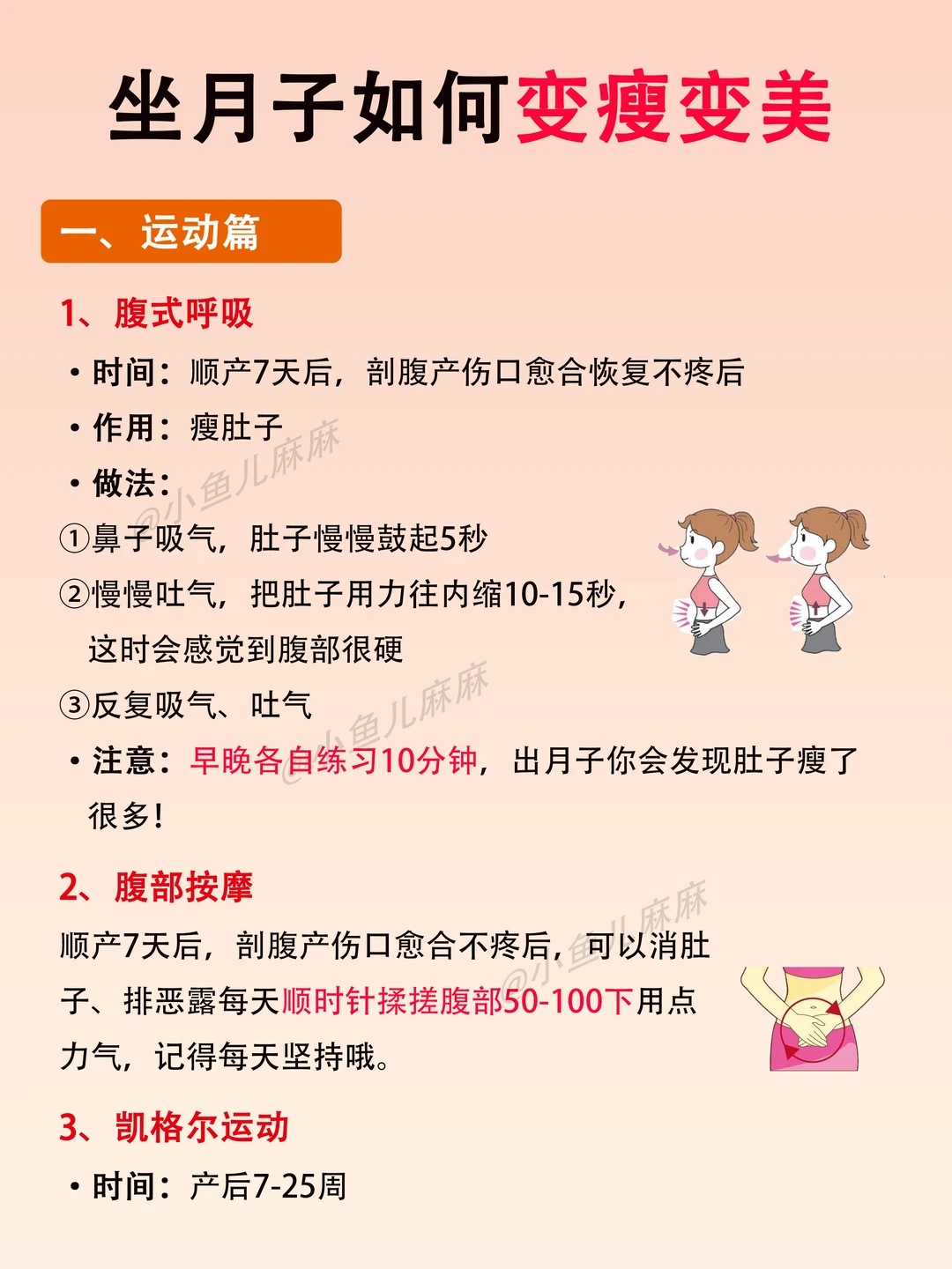 生活需要分享欲 👉🏻生完宝宝才知道,月子坐得好,真的可以变瘦变美的~ 月子里我做常做的17个小技巧,分享给你们参考 🔆运动篇 腹式呼吸 腹部按摩 凯格尔运动 上肢运动 🔆 饮食篇 多喝水 饮食结构调整 产后的饮食顺序 月子水(附做法) 🔆睡眠篇 保证充足的睡眠 🔆其他篇 坚持泡脚 合理佩戴收腹带 头发养护 心情愉悦 肚子黑线处理 护肤管理 减脂误区 - 具体方法看图哈! 最后!祝愿各位姐妹们开开心心坐好月子~