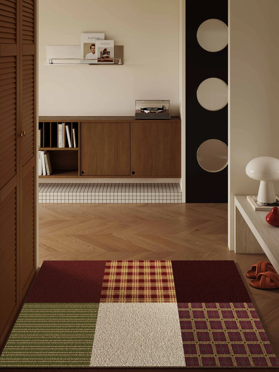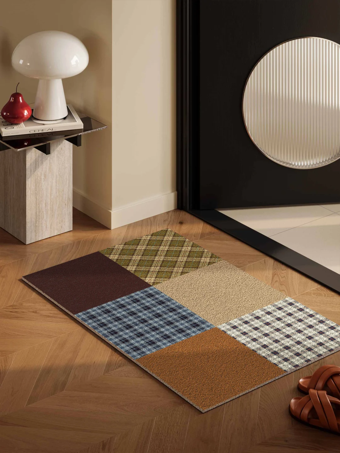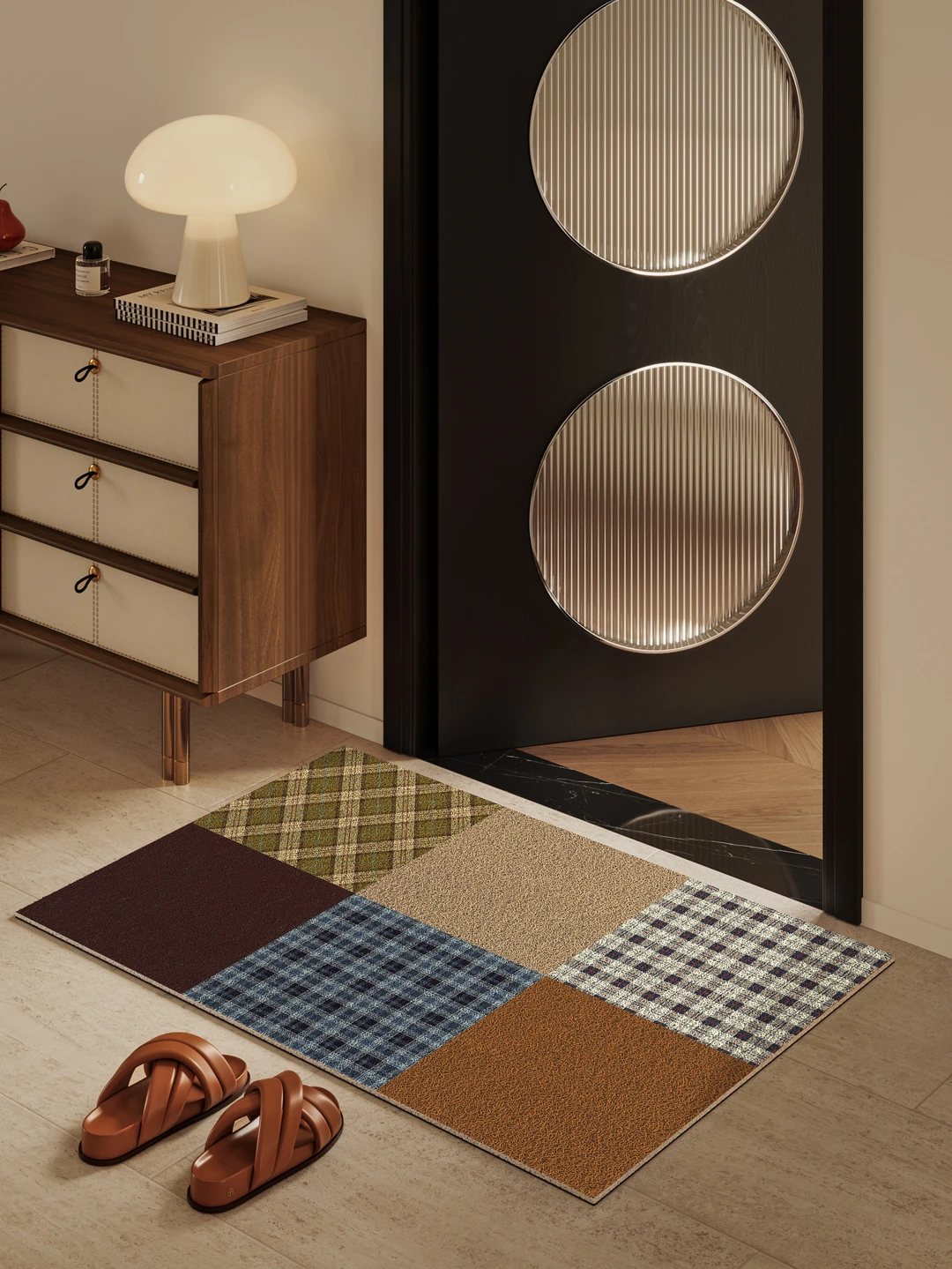 Patchwork 设计 + 复古格纹碰撞 焦糖棕与雾霾蓝交织的复古氛围感 格纹 / 纯色多元拼接 把中古风的松弛感焊在玄关 叠搭苏格兰格纹与纯色块面 复古美学融入现代家居语境 打造高级耐看不撞款的入户仪式感!! -