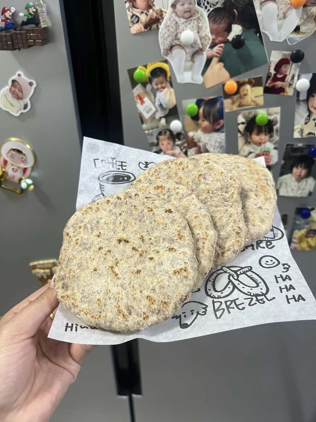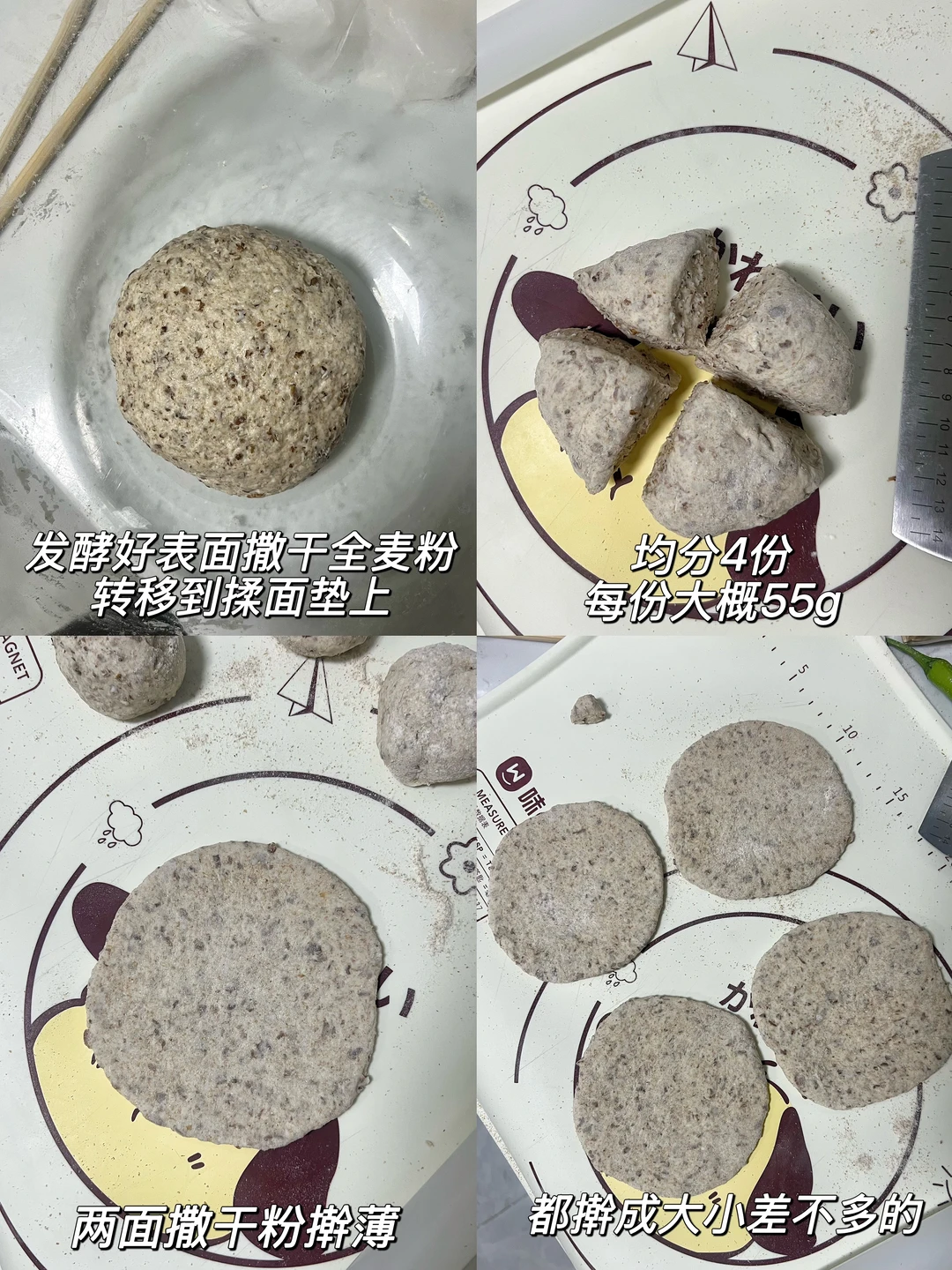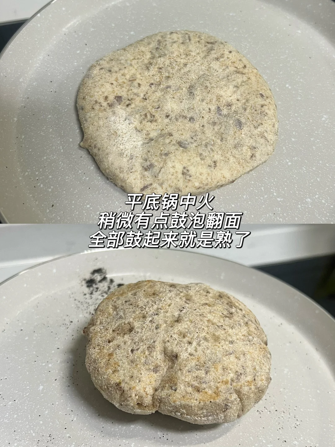 原版是纯白面,我替换了40%的全麦粉 几乎没什么难度,揉一揉就能成功 需要注意点火候,小火鼓不起来,大火容易糊,全程中火! —— 食材:(4个) 黑全麦25g、开水50g 中筋粉60g、全麦粉40g、清水40g、盐1g、干酵母1.5g —— 可以一次性多做些冻起来慢慢吃,随便搭配点牛肉/虾和蔬菜就是一顿完美减脂餐