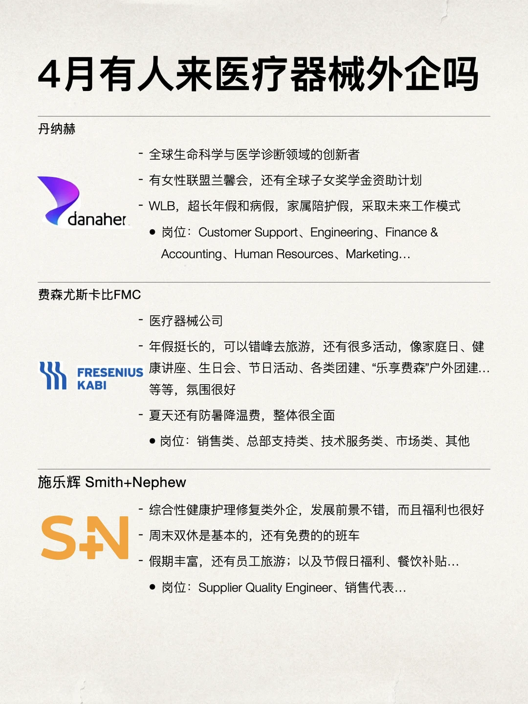 对大健康方向感兴趣的,其实可以去试试医疗器械方向的公司。很多都挺低调,但真的很稳,需求一直在、行业周期也长 团队氛围很好,都比较有边界感,节奏大多也都是 955、双休,年假 12–15 天起,有些项目节点会忙一点,但整体都还好 如果是想找一个长期发展、同时又不那么卷的行业,医疗器械外企其实很值得看看 坚持日更✊🏻,对外企感兴趣的欢迎常来看看
