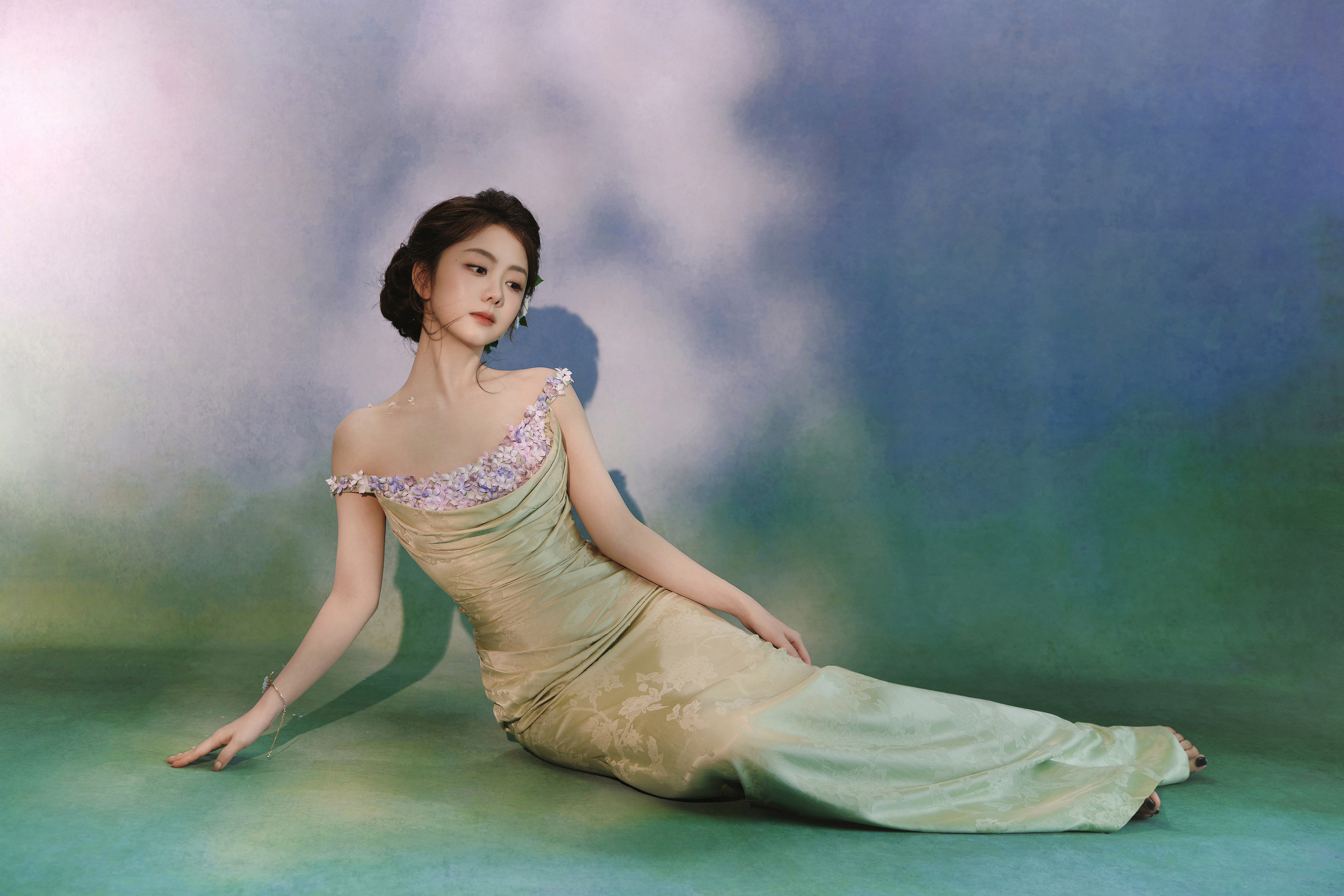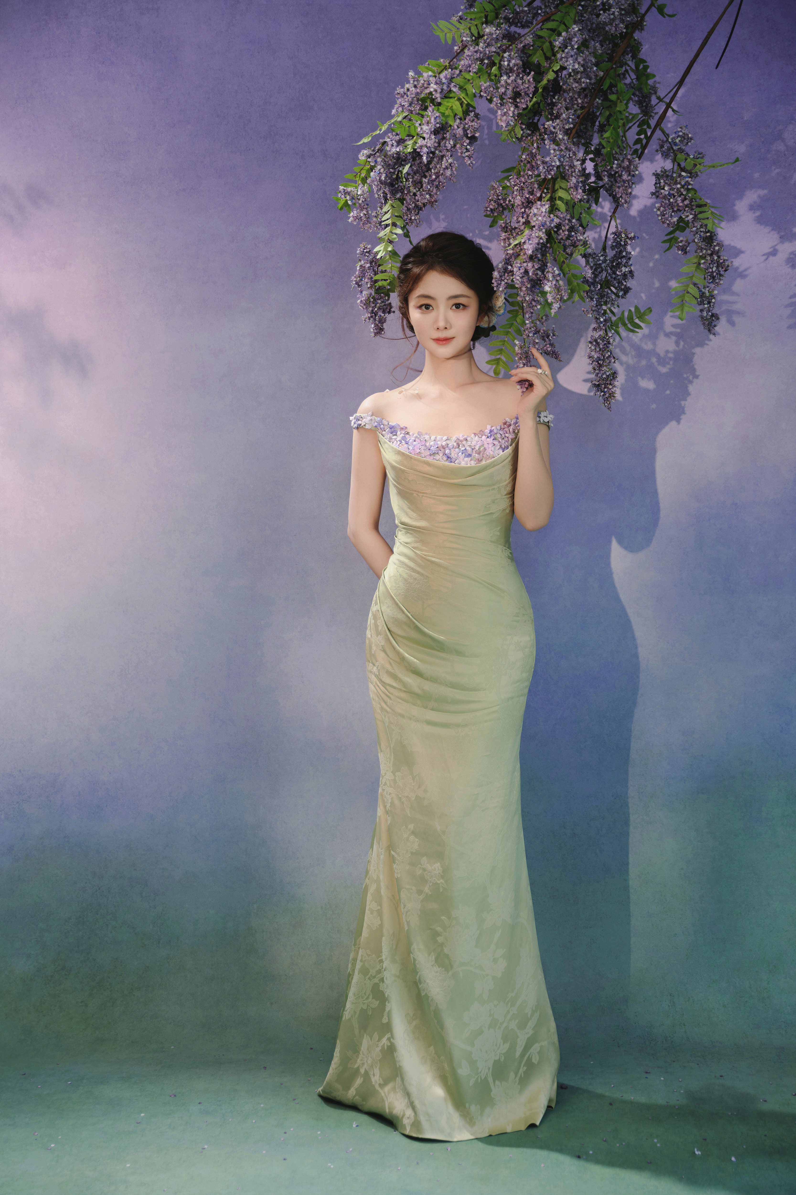 谭松韵 紫藤从颈间蔓出芬芳花香,于典雅之间遇见自然。两小姐身穿提花缎面长裙,回到