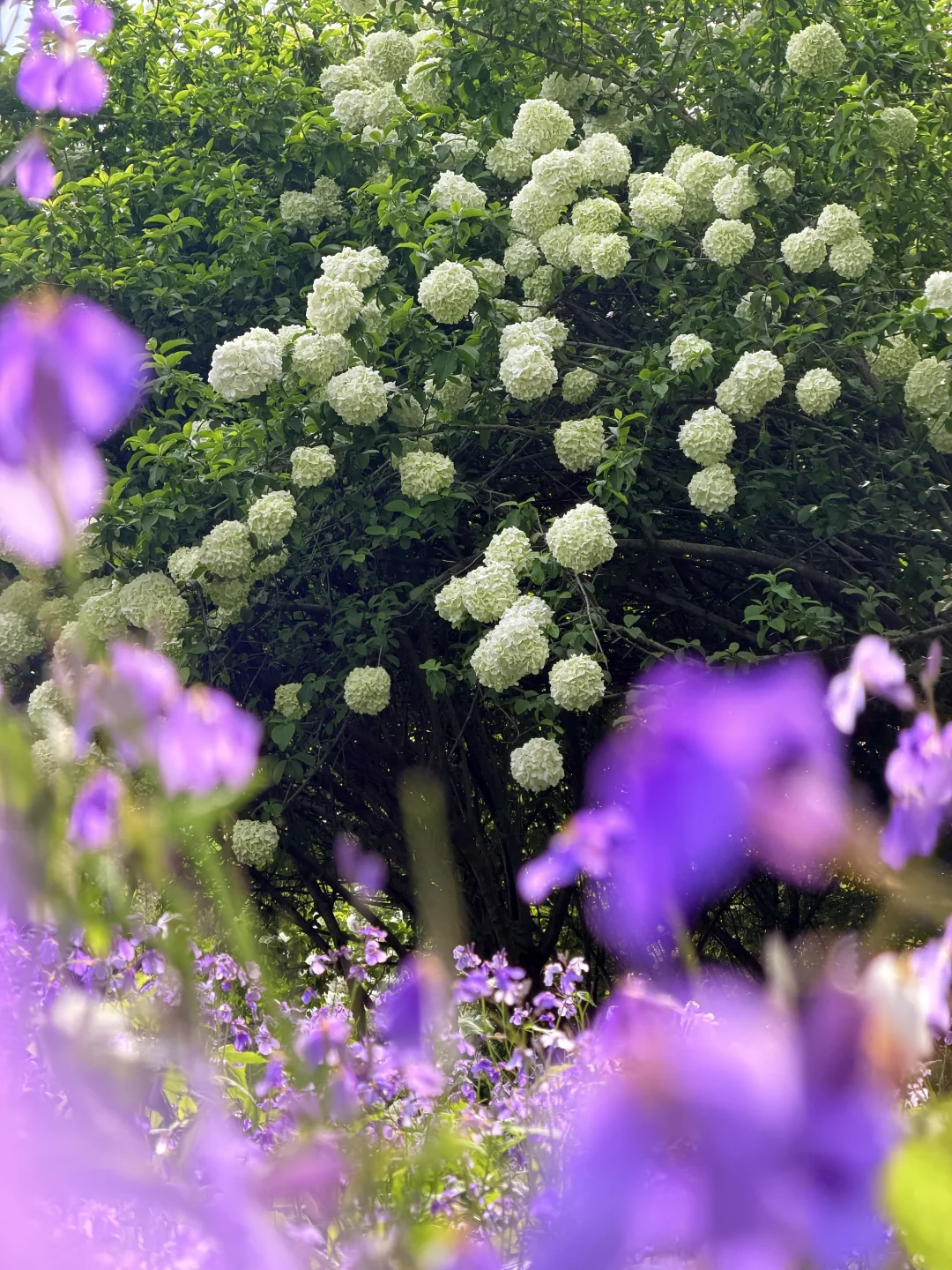 ✅ 火柿路:封神机位!200米绣球花廊,几十株木绣球连成白色花墙,搭配路边紫色二月兰,白紫撞色美到失语,石桥、花径同框,随手拍都是江南画卷