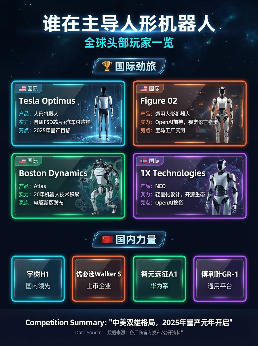目前中美双雄格局已现:Tesla Optimus、Figure 02、Boston Dynamics Atlas领跑国际,宇树H1、优必选Walker S、智元远征A1、傅利叶GR-1则代表国内最强力量。