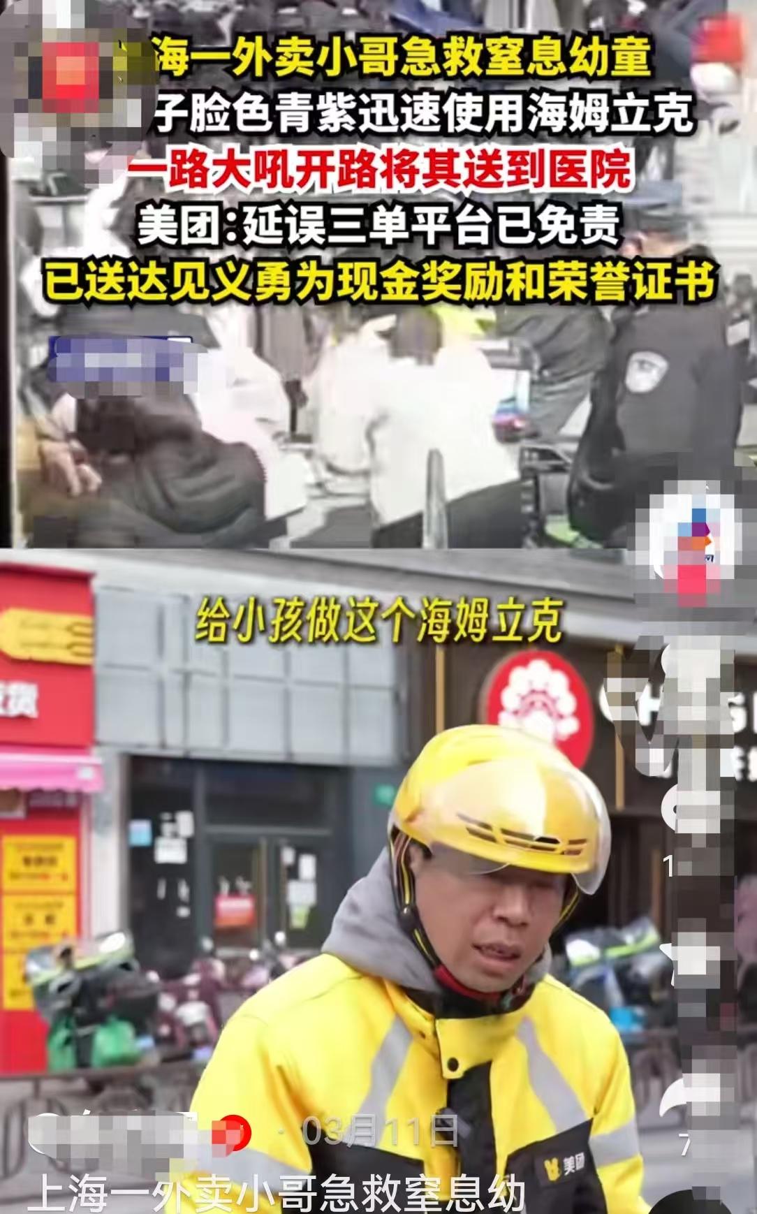 在这个人情薄如纸的时代,总有一些人愿意用善举温暖人心,让我们感受到社会的温情。 3月10日中午11时许,上海松江云间新天地,一名一岁多幼童因误吞饼干异物卡喉窒息、脸色发黑,孩子的母亲束手无策,焦急万分,此时,美团骑手侯海富送单路过,他发现后,当机立断扔下订单,用海姆立克急救法持续为孩子施救约40秒,卡在孩子喉管里玉米粒大小的饼干块终于被成功取出。但孩子仍无法睁眼,情况还在危急之中,侯海富征得家长同意后,一手抱娃一手骑车,疾驰800多米将孩子送至方塔医院,直到确认孩子脱危后默默离开、他才重返工作岗位。 41岁的侯海富是河南汉子,他背井离乡,来到上海,靠送外卖维持一家人的生计,他的生活过得并不宽裕。但他在送单途中看到孩子情况危急,抛开个人利益,扔下手中的单,当机立断去紧急抢救孩子的生命,事后默默离开。他纯朴的善举温暖了我们,更温暖了全社会。 像侯海富这样善良的美团骑手还很多美,为此,2025年11月,美团全面升级好人好事和见义勇为长期激励计划,表彰金最高10万元,如重大事迹获官方认定,还将给予额外激励。目前,美团已累计奖励1128名见义勇为、有突出助人事迹的骑手,为他们发放了总价值数千万元的现金、大病保障、学历进修费用等各类奖励。 我们的社会正因为有了侯海富,有了美团,才让我们感受到人间的温情是如此温暖。