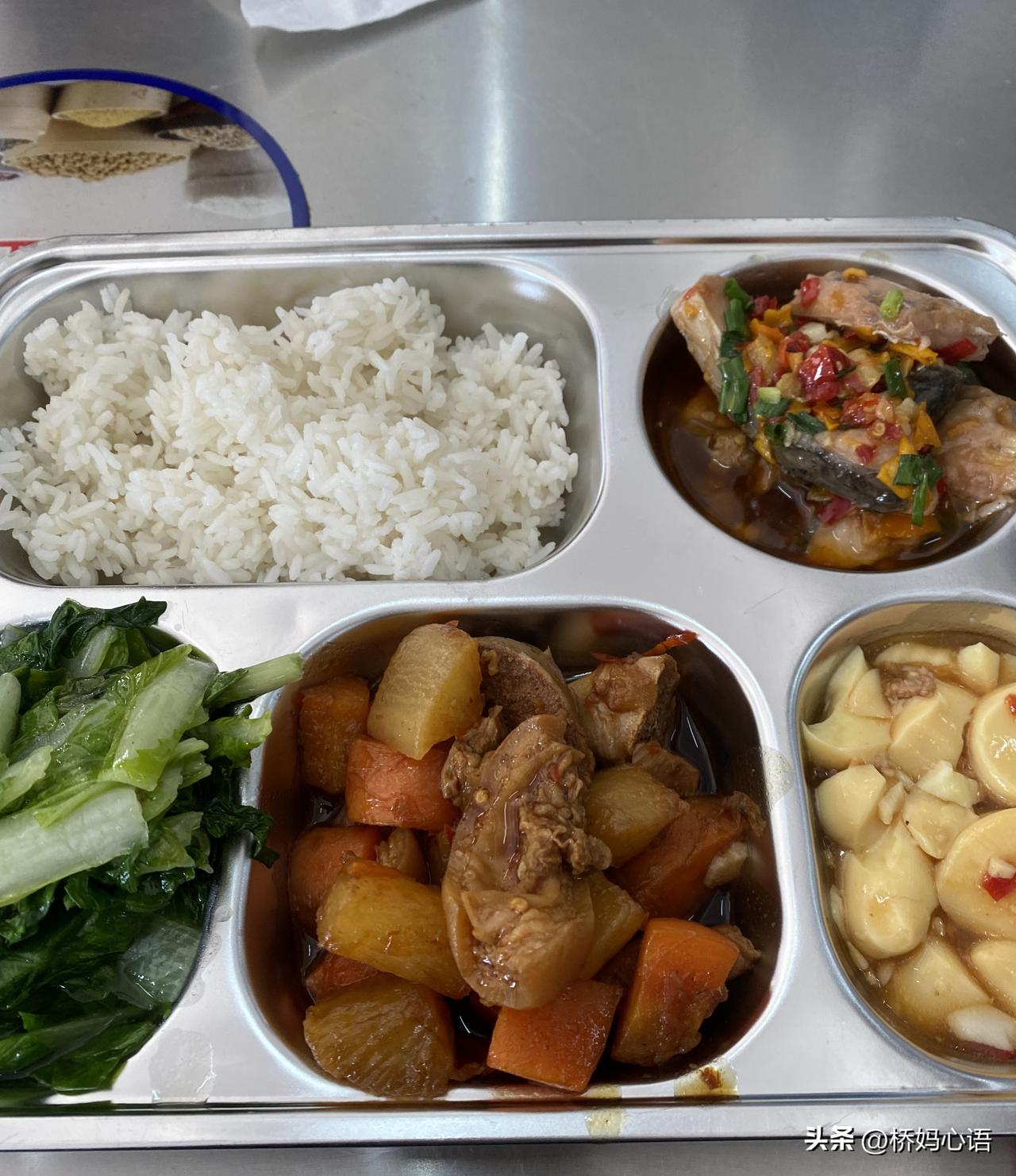 我点了两荤两素,红烧鱼,猪蹄土豆,白菜,烧豆腐,拿了一小碗米饭。